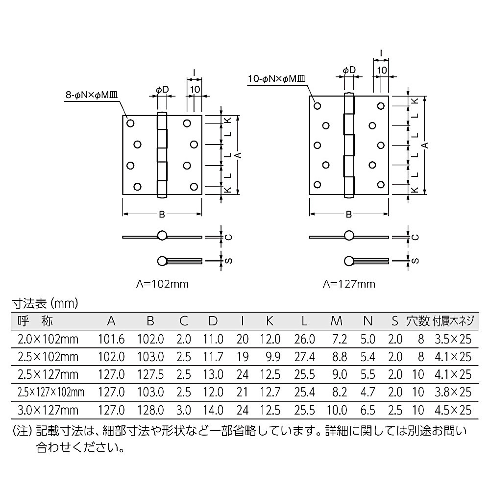 メーカー名ベスト商品名平儀星蝶番品番No.130用途軽量ドア中量ドア(3.0×127mmのみ)材質羽根:ステンレス鋼 SUS304軸芯:ステンレス鋼 SUS304仕上・色ヘアラインゴールド古代ブロンズ黒特長RAシステム(芯棒せり上がり防止)採用参考重量軽量ドア:15kg以上30kg未満中量ドア:30kg以上50kg未満重量ドア:50kg以上80kg未満