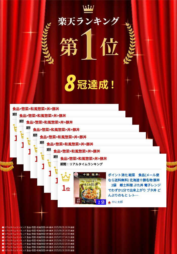 「北海道十勝の豚丼」の詳細 北海道帯広・十勝の郷土料理、ぶた丼。 電子レンジでわずか1分で出来上がり、手間いらずのブタ丼の具です 醤油をベースにして、生姜を合わせた独特の甘辛いタレの味付けが、豚肉の旨味を引き出しています。 ※入荷によりパッケージが変わることがあります (メール便配送のみ、送料無料) 商品名 十勝名物 ブタ丼 2袋 炭火焼風(1袋90g前後) 北海道産 アレルギー物質を含む原料 豚肉・小麦・大豆 原材料:豚肉、醤油、砂糖、発酵調味料、清酒、生姜、食塩、香辛料、増粘剤、アルコール、カラメル色素、香料、調味料(アミノ酸等) 食べ方について 電子レンジで温める 外袋から「豚丼」を取り出し、内袋は開けずに、蒸気口のあたる面を上にしてさらにのせ、電子レンジで温めて下さい。 お湯で温める 外袋から「ブタ丼」を取り出し、内袋のまま熱湯の中に入れ、3〜5分間温めて下さい。 お届け予定日 メール便 同梱 不可 ●メール便のため、到着日の指定・配送時間の指定は承っておりません ※ご注文内容確認後、4日〜7日程度の目安でお願いいたします 賞味期限 目安 常温300日。 開封後は、お早めにお召し上がり下さい。 返品特約条件 使用できないカード こちらをご参照下さい ●デビットカードはご利用できません。 お支払い メール便 同梱 不可 ●クレジット決済・コンビニ先払い・銀行振込・楽天後払い限定とさせて頂きます。 ●代金引換は、不可能です 配送方法 4〜7日前後のお届となります。(当店発送日より) 沖縄・離島は場所により余計に日数がかかります。 メール便は常温配送です。 ※道路状況・天候等の諸事情で到着が遅れる場合がございます。 送料 配達業者 メール便 同梱 不可 ヤマト運輸での配送となります(郵便ポスト受け) 他の商品との同梱はできません ●他の商品と同梱した場合は、ヤマト運輸の通常料金での配送となり、送料が別途かかります。 ヤマト運輸 通常料金 同梱可能 送料はこちらをご参照下さい。 ●受注確認後、送料を変更します。 領収書の発行について 商品に、領収書などは同梱しておりません。 必要な場合、下記のURLの「▼領収書・請求書の発行方法」に 画像付きで、説明があります。 https://ichiba.faq.rakuten.net/detail/000006734 領収書発行の手順は、 楽天トップページ「購入履歴」→ 商品一覧から「注文詳細」→「領収書・請求書」→名前入力後「発行する」 (発行は、商品出荷後にダウンロードできます) 北海道のグルメお取り寄せ。ぶた肉 どんぶりの具お中元/お歳暮/父の日/母の日/敬老の日/バレンタイン/ホワイトデーの定番ギフトイベントや、御祝/御礼/内祝いなど祝儀の品、手土産/おみやげ/贈答品としてもご利用頂けます。各種のしの対応致します。nop00LINE友だち登録はコチラから 北海道十勝の名物、豚丼 豚丼は北海道帯広や十勝で郷土料理として親しまれています。 醤油をベースにして、生姜を合わせた独特の甘辛いタレの味付けが、豚肉の旨味を引き出しています。 (タレは北海道の南華園を使用しています) 焼かずとも、電子レンジで1分ほど温めた後、ご飯の上にのせるだけで手軽にぶた丼が食べられます。 電子レンジで温める 外袋から「豚丼」を取り出し、内袋は開けずに、蒸気口のあたる面を上にしてさらにのせ、電子レンジで温めて下さい。 500W:約1分20秒 600W:約1分 お湯で温める 外袋から「ブタ丼」を取り出し、内袋のまま熱湯の中に入れ、3〜5分間温めて下さい。 ●ご注意●沸騰したお湯からブタ丼の袋を取り出すとき、火傷にご注意ください。 ●他の商品と同梱した場合は、 ヤマト運輸の通常料金での配送となり、送料が別途かかります。 ●冷凍品との同梱は出来ません。 お届け方法 ヤマト運輸・メール便 他の商品、同梱 ●他の商品と同梱した場合は、ヤマト運輸の通常料金での配送となり、送料が別途かかります。 到着日の指定 4日〜7日程度かかります 支払方法 クレジット決済 コンビニ先払い 銀行振込楽天後払い 送料 送料無料 ポストにお届け