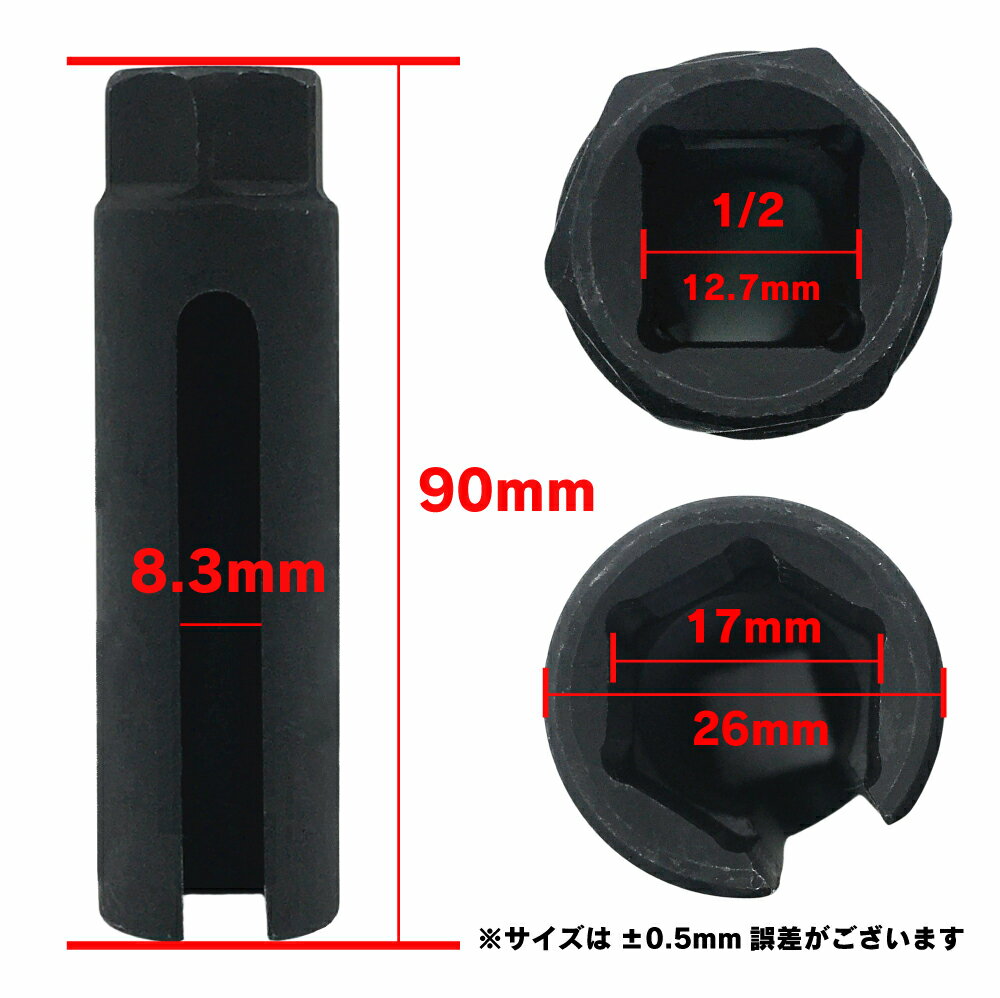 商品説明メーカー名KEA(関西エコ・アープ)商品名KEA O2センサーソケットメーカー品番LT-ST02詳細 O2センサーの脱着に便利なソケット センサーの配線を逃がす幅8.3mmのスリットが入っているので作業がスムーズです。 【仕様】 差込角:12.7mm 1/2 全長:90mm 幅:26mm スリット幅:8.3mm 注意 ・ご購入前に、必ずスリットのサイズとソケットが使用できるスペースが確保されているか確認してください。 ・トルクレンチを使用し、メーカーの規定トルクで締めつけてください。・配線をねじり切る恐れがありますので、センサーを外す際は先にカプラーを外してください。