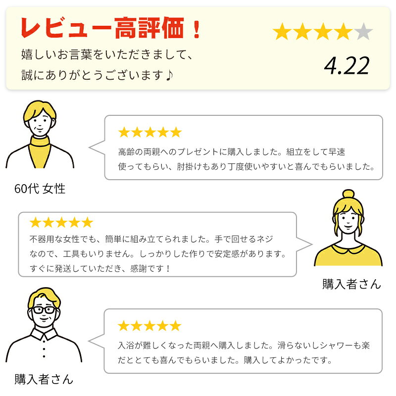 商品スペック 商品紹介 🍰【素材】 アルミ合金製フレームとPE(ポリエチレン)素材を採用、軽くて強度・耐食性が高い、乾きも早い。最高荷重は約140KGです。また、脚ゴムはワイド仕様のものを使用、安定性を高め、より滑り転倒しにくい。 🍰【工具不要、簡単組立て】 製品全体はネジで固定するので、工具なしで簡単に組立てできる。ベンチタイプ、背もたれ付きチェアタイプ、肘掛け付きベンチタイプ、フルタイプの4種類に組立てができる。 🍰【背もたれ・肘掛け(手すり)・シャワーフック付き】 背もたれと手すりタイプの肘掛けがしっかり身体を支えてくれる。身体を移動する際、肘掛けを背もたれ側に跳ね上げられるので、動きを妨げることなく、固定タイプよりも便利。ネジで固定しているので、取外しもできる。シャワーヘッドが掛けられるフックが付属している。 🍰【高さ6段階調節】 ボールボダンを押しながら、調節パイプをスライドしてチェアの足に空けられた穴に合わせて高さを調整する仕組みになっております。座面の高さは37-48.5の間に6段階調ができ、個人に合った高さに調節しやすく、腰への負担を減少できる。 🍰【広いU字型座面】 座面が広いので身体を洗う動作がしやすい。また、座面がU字型で、シャワーヘッドが座面の真ん中を通れるので、下半身をより楽に洗える。 商品詳細 【商品名称】バスチェア 【耐荷重】140キロ 検索キーワード シャワー用いす 風呂いす 入浴介護用品 浴用椅子 シャワーチェアー お風呂椅子 介護ダイニングチェア 軽量 丈夫 入浴用品 アルミ合金フレーム 立ち上がり補助 軽量コンパクトシャワーチェアー 背もたれ付お風呂椅子 介護 手すり 組み立て簡単 日本語説明書付き 転倒防止 お風呂用品関連商品はこちらRAKU シャワーチェア バスチェア 折りた...9,998円RAKU シャワーチェア 介護用風呂椅子 風...9,998円