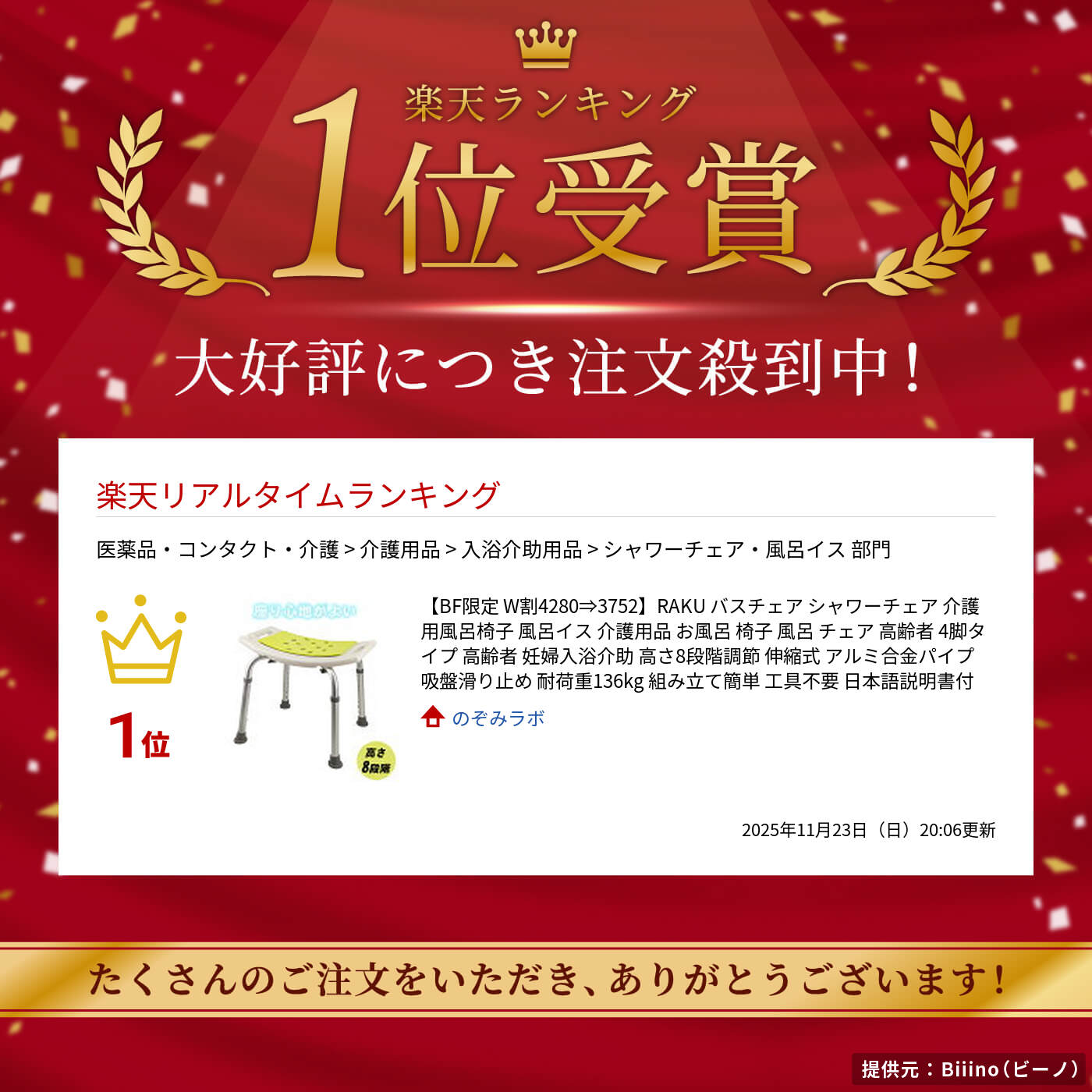 商品スペック 商品紹介 🍧【デザイン性に優れる】 なだらかなカーブを描いた座面は、お尻をしっかり支えてくれ、座り心地を実現します。緩やかなカーブの背もたれは体に優しくフィットし、安定感もあります。 🍧【高さ8段階調節・滑り止め】 足についているボタンを押しながらスライドさせれば、8段階で好みの高さに変えることができます。また、足部分には滑り止め仕様になり、安心して使用できます。 🍧【機能性抜群】 座席に12個な排水穴があり、水が溜まらないから防カビできます。座面の横には立ち上がる時に楽な持ち手がついていて、移動がしやすい。サイドにはシャワーヘッドが掛けられる、とても便利。 🍧【良い素材・マット】 アルミ製の軽量バスチェアで錆びはしないし、1.25mmの厚さでより堅固し、耐荷重は136kgです。体が大きな男性にも安心してお使いいただけます。やわらかいマットがついているので、冬にお尻がひんやりして寒い方にはうれしいポイントです。 🍧【組立簡単】 道具がいらないし、手でネジを回すだけで組み立てできます。女性でも簡単に組立できるバスチェアです。 商品詳細 【商品名称】バスチェア 【耐荷重】136キロ関連商品はこちらRAKU シャワーチェア 介護用チェア バス...4,998円RAKU シャワーチェア 介護用風呂椅子 風...9,998円