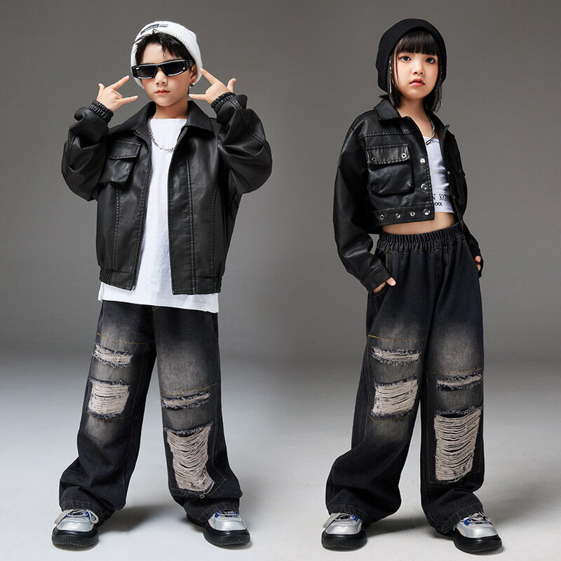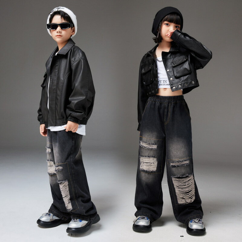 キッズ ダンス衣装 レザージャケット デニムパンツ ヒップホップ 革ブルゾン 防風 PU ダメージ加工 ジーンズ ライダース子ども服 女の子 男の子 かっこいい 子供ダンス服 セットアップ K-POPステージ衣装 ダンスウェア 舞台 HIPHOP JAZZ 発表会 演出服 秋冬 普段着 単品販売