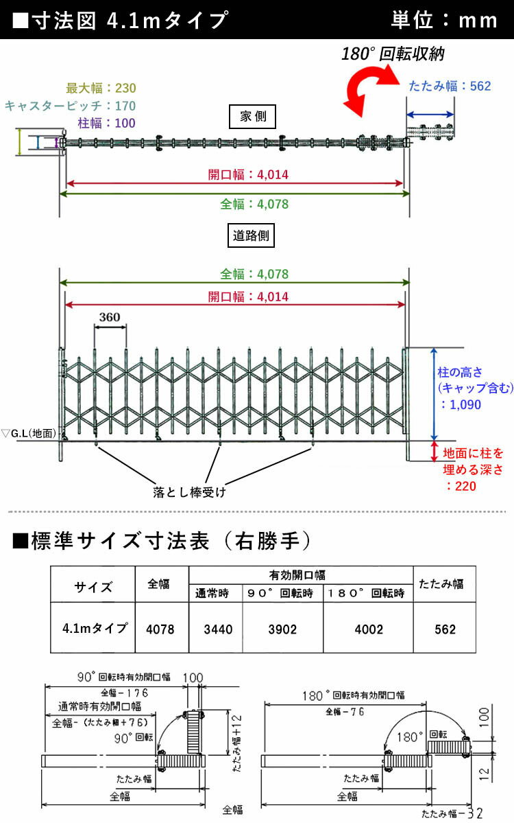 伸縮門扉(駐車場 ゲート)当店人気No,1 □伸縮ゲートは安心の日本製、多くのお客様からご注文を頂く大人気商品 □国内アルミ老舗メーカーとのコラボ品,高品質なアコーディオン門扉を手頃な価格で提供 □車庫まわりの防犯対策にオススメの片開きカーテンゲート 説明 こちらの商品は国内生産 made in Japan製品です 激安アコーディオン伸縮門扉(伸縮ゲート/カーゲート/カーテンゲート/アコーディオンフェンス/駐車場の入り口) 安心/安全の日本製 片開き仕様の伸縮アルミフェンスは、 老舗メーカーとコラボ商品のため、 コストパフォーマンスに優れており、高品質で耐久性が抜群です 先端と中間にダブルキャスターを設置しスムーズな開閉かつ、静かで軽い動作を実現しました 吊元は、右閉じ・左閉じ両対応設計で簡単にDIY設置が可能です 広い間口幅を実現する180°回転収納式です 施工性にも優れており、 当社のお客様の中には自分で取り付け工事をする方が多く 初めての日曜大工や女性の方も多くDIYされています ▼こんな方にオススメ ・元々ついていたジャバラ門扉が壊れた方 ・ホームセンターで探したが高かった、鍵はいらないけど高品質で安い門扉をお探しの方 ・外構エクステリア工事の施主支給品として お子様やペットの道路への飛び出し抑制や 店舗/施設/学校/駐車場/庭ガーデンetc. 新築/新居 付け替え/買い替え/入れ替え/交換/修理/リフォームなどにご利用下さい 商品詳細は、寸法図画像及びサイズ説明をご覧下さい その他ご不明な点は DIYガーデン通販のエクステリア関東へ お気軽にお問い合わせ下さい サイズ 全幅:4,078mm 地面からの高さ:1,090mm たたみ幅:562mm 材質 本体:アルミ形材 カラー 本体色:ブラック メーカー アコーディオン門扉のパイオニアメーカー国産品 送料 全国送料無料(北海道・離島を除く) 北海道(離島を除く)送料:ご注文個数×2,200円(税込) 沖縄・離島・その他一部地域のお客様は、 別途送料をお見積りさせて頂きますのでお気軽にお問い合わせ下さい。 注意事項 ペットガード仕様ではありません。寸法図面を必ずご確認下さい。 モニターの具合により、掲載写真と実際の商品の色が異なって見える場合がございます。 予めご了承下さい。 ねじやボルト等に緩みがないか締まり具合を確認して下さい。 門扉の開閉テストをして下さい。 人や物等の障害物のないことを確認してから操作して下さい。 門扉をゆすったり、乗ったり、寄りかかったり、物を乗せたりしないで下さい。 キャスターが走行する床面に、ゴミ・土・砂・雨水などがたまらないようにして下さい。 落とし棒受けのごみは取り除いて、落とし棒は開閉時ともに必ず落して下さい。 強風時にはロープで固定して下さい。 ▼交換・修理用パーツ販売はこちら▼ ※クリックすると商品ページへ進みます >>戸当たり柱(受け柱)1本 >>吊元柱1本 >>戸当たり柱+吊元柱セット >>取っ手(ハンドル)両側セット >>ダブルキャスター(車輪)セット >>縦桟キャップ5個セット ▼取付方法をご紹介しています▼ オリジナル伸縮門扉取扱説明書を見る <関連キーワード>(本商品の説明ではありません) アコーディオン門扉 駐車場 ゲート 伸縮ゲート 伸縮 ゲート 門 フェンス カーゲート カーテンゲート アコーディオンフェンス 駐車場の入り口 ジャバラ門扉 お子様やペットの道路への飛び出し抑制 1m 1メートル 100cm 1000mm 3m 300cm 3000mm 3メートル 3m 3.7m 370cm 4m 4000mm 4メートル 4m 4.1m 410cm センチメートル 大きい 小さい 広い ひろい 狭い せまい 屋外 外構 施主支給 店舗 施設 学校 庭ガーデン 新築 新居 付け替え 買い替え 入れ替え 交換 修理 リフォームアコーディオン門扉(片開き 4.1m ブラック) DIY・ガーデン通販エクステリア関東オリジナルの超お買い得価格の伸縮門扉 片開き4.1m※参考画像です柱・本体のフルセット 当社オリジナルの伸縮門扉 オリジナルアコーディオン伸縮門扉の使いやすい6つのポイント! 1.GLラインのステッカーGLラインは、ここまで地面に埋め込むという印になります。シールが貼ってあるので、設置が簡単 2.ダブルキャスターダブルキャスターで硬質ゴム製のタイヤは滑らかに動きます。高さ10mmまで上下可能です。 3.ラッチでしっかり固定ラッチがしっかりと受け柱と門扉本体を固定します。固定の際は落とし棒も使用してください。鍵は付属しておりません。 4.落とし棒キャスターの横には落とし棒がついているので門扉を固定する際に使用してください。 5.ヒンジの取り付けでヒンジの取り付け方で、右開き・左開き・内開き・外開きと自由に設置が可能です。 6.受け柱本体と、受け柱が2本セットになります。 ■安心・安全の国内生産品 複雑な構造の伸縮門扉は、熟練した職人の手で一つ一つ組み上げます全ての工程が安心・安全の国内生産品です老舗メーカーとの共同開発商品のため、低価格・高品質が実現しました ■本体カラーは3色展開※4.1mタイプのみステン色もございます つや消しブラック ブロンズ ステンカラー ■寸法図 4.1mタイ