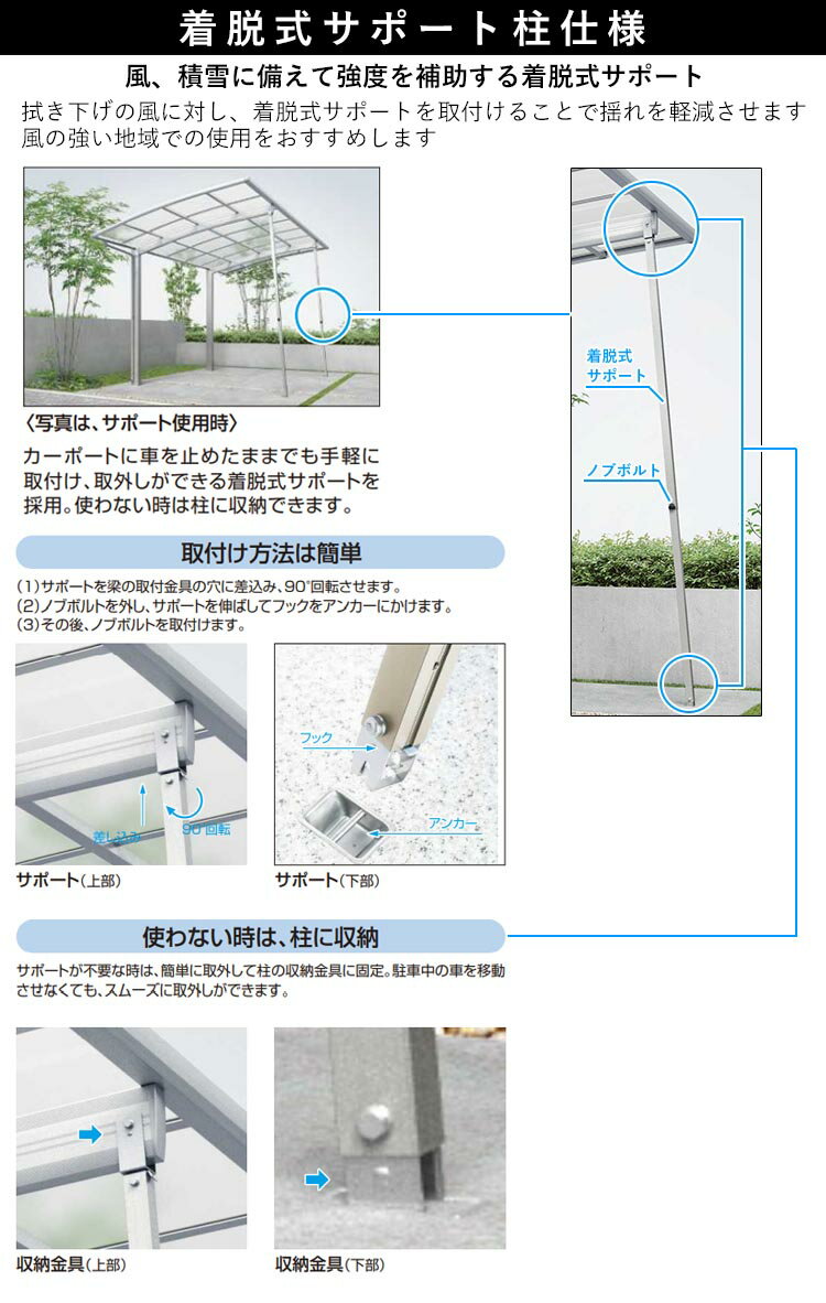 サイクルポートの強風・積雪対策のサポート柱(補助柱) ■屋根の安定性を向上させるサイクルポートオプション ■後付けDIY可能で、台風や大雪などの悪天候時にサイクルポートの強度を補助 ■収納スペースを取らず、必要な時だけ取り付けて使用できる着脱式着脱式サポート柱(補助支柱)標準・ハイルーフ柱兼用の商品詳細 説明 サイクルポートを安定させる着脱式サポート支柱です。 YKKサイクルポート一般地用の標準柱・ハイルーフ柱兼用の商品です。 片柱仕様のサイクルポートの強風時のあおりをおさえる着脱式サポート。 サポートの足元は埋め込み式ですので、サポート未使用時でもつまづくことがないよう配慮しています。 冬季にはご注文が殺到しますので、お早目のご注文をお待ちしております!! 伸縮サイズ:約1700mm〜3000mm 対応商品 【H22 標準・H25 ハイルーフ兼用】 ・アリュース ミニ 600タイプ(奥行57サイズ以外) ・アリュース ミニ RE 600タイプ ・アリュース Z ミニ 750タイプ メーカー YKK AP カラー ブラウン・カームブラック・プラチナステン・ピュアシルバー・ホワイトの5色からお選びください ▽入り数 2本 送料 関東地方・長野県・宮城県・(愛知県※一部エリアのみ) 左記エリア以外 関東地方・長野県・宮城県・(愛知県※一部エリアのみ) 【ご自宅までお届けです】 東京都・神奈川県・埼玉県・千葉県・茨城県・栃木県・群馬県・長野県・宮城県・(愛知県※一部エリアのみ) ■送料無料(ご自宅までの配送) 平日の便でのお届けです (※お時間のご指定は出来ません) ご注文時の備考欄にご不在時の荷下ろし場所をご指定頂く事で上記送料となります ご不在時の荷下ろし場所は細かな指定が可能なので、詳細をご記載下さい ご自宅確認のために当社より電話連絡が入ります ご対応をお願いします ※集合住宅は配送不可 ご不明な点がありましたらお気軽にお電話にてお問い合わせ下さい 左記エリア以外 【別途送料がかかります】 北海道・東北地方・山梨県・新潟県・岐阜県・三重県・北陸地方・近畿地方・中国地方・四国地方・九州地方(離島を除く) ■送料 ・お住まいお近くの西濃運輸支店にてお引取の場合:2,000 円(税込) ・法人様宛ご住所までの配送の場合(屋号必須):2,000 円(税込) ・個人様宛ご住所までの配送の場合:6,000円(税込) 注意事項 モニターの具合により、掲載写真と実際の商品の色が異なって見える場合がございます。 在庫状況につきましては、お気軽に当店フリーダイヤルまでお問い合わせ下さい。 ▼PDFファイルで取付方法をご紹介しています▼ >着脱式サポート柱(補助柱) 取説 YKK AP 着脱式サポート柱 一覧はこちら 〇カーポート用補助柱(サポート柱)一覧にもどる○ ●お店のトップページへもどる●