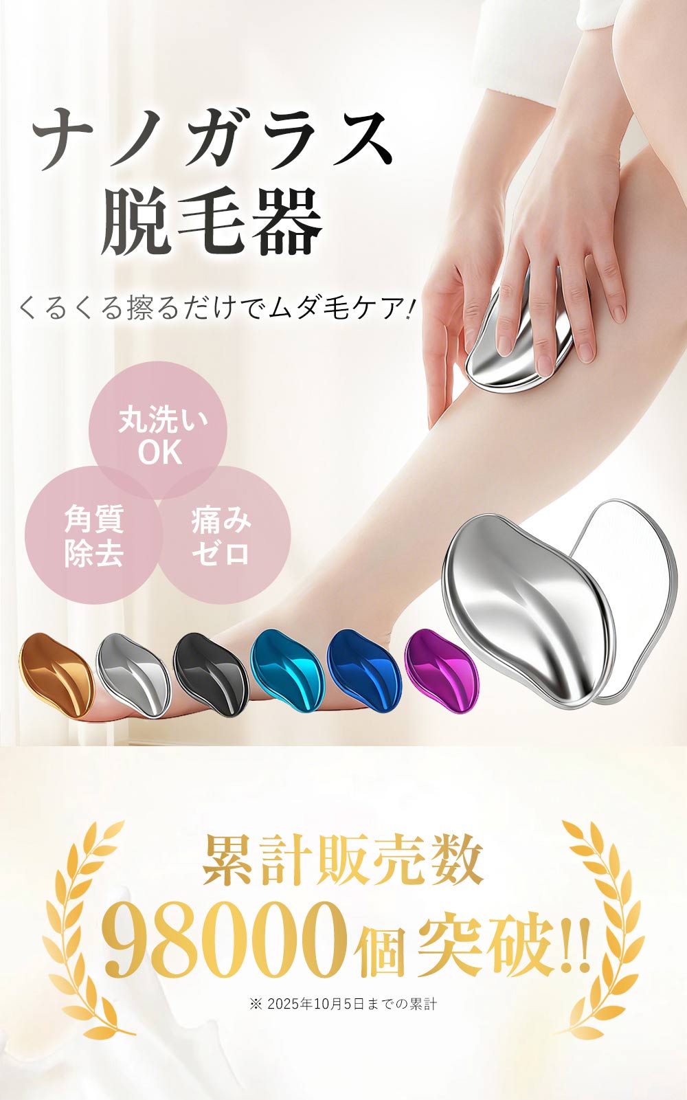 メーカー希望小売価格はメーカーサイトに基づいて掲載しています 商品情報 商品名 【無痛新世代】ナノガラス脱毛器+角質ケア 材質 ナノガラス、樹脂ABS 重量 約55g(手のひらサイズ、携帯便利) 対象 男女兼用、子供も使用可能 使用上の注意事項 ・顔・VIO・脇などのデリケート部位には使用しないでください。 ・使用後は必ず保湿クリームなどでお肌をケアしてください。 ・痛みや違和感がある場合は、すぐに使用を中止してください。 ・強くこすったり、力を入れすぎないようご注意ください。 ・日焼け後や医療脱毛・機械脱毛の前後は使用を避けてください。 ・同じ箇所を長時間使用しないでください。 ご使用方法 1)ぬるま湯で温める:入浴中やシャワー後など、肌が柔らかくなったタイミングで使用がおすすめ。 2)くるくるこする:気になる部分に軽くあて、円を描くようにやさしく動かします。 3)クリームで保湿:使用後は肌が乾燥しやすいため、保湿クリームでしっかりケア。 4)携帯便利:手のひらサイズ、充電不要、水洗いOKでいつでもサロン品質。 商品の特徴・ポイント ・完全無痛、化学成分ゼロで敏感肌も安心 ・微細なナノ粒子でムダ毛と角質を同時ケア ・接触面が滑らかで痛みや刺激を最小限に抑える ・高品質で耐久性あり、繰り返し使用可能 ・男女兼用で第一印象UP ・旅行・出張・ジム後でもポケットでサロン品質 品質保証 商品到着後7日以内に初期不良の場合のみ返品・交換可能。 使用後の返品・交換は保証対象外。