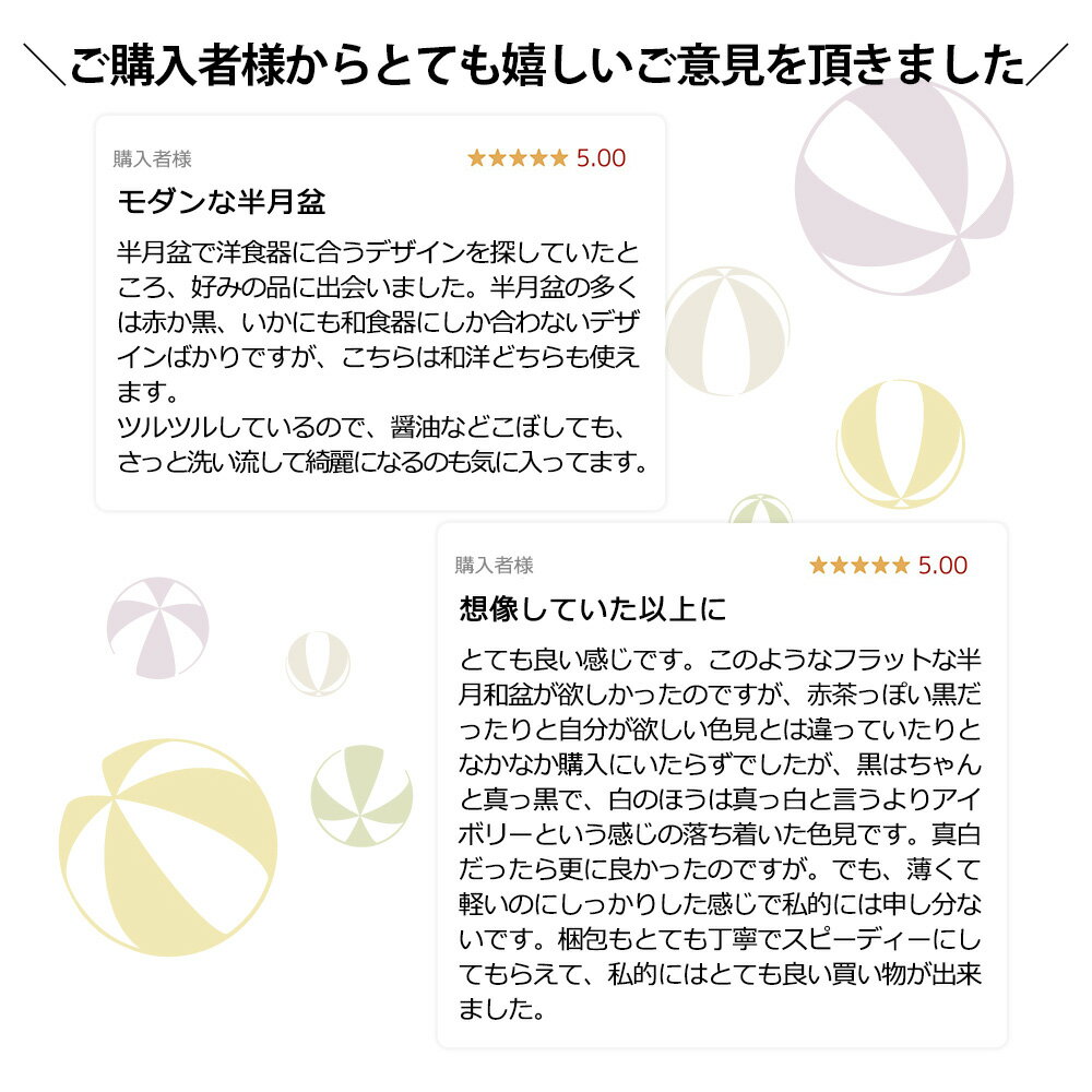 商品仕様サイズ394 × 349 × H4 (mm)素材ABS樹脂塗装ウレタン塗装産地日本製(福井県)包装OPP袋注意事項食器洗浄機 ×電子レンジ ×オーブン ×手作りの為サイズや色に僅かな違いが生じる場合があります。記事内容キッチンアイテムはインテリアに映えるよう丁寧に選びます。フードコーディネーターの経歴を持つ進藤由美子さん。お料理はもちろんのこと、素敵なテーブルセッティングも生徒さんに人気です。「ちょっとした演出でテーブルの見せ方変わります。ものの選び方も同じ。道具もインテリアの1つとして選ぶと、キッチンが華やぎます。」折敷は生徒全員がオーダー。リバーシブルに使えて、和洋ともに演出の幅が広がります。リーズナブルなもの人気の理由。店長たけさんから感謝の一言店長の竹内です。この商品は漆器に対して扱いにくいやお正月にしか使わない…というイメージやご意見を頂いた事をきっかけで「より普段使いしやすい漆器を作ろう!」という想いから企画がスタートした商品の一つです。普通の食器類と同じように洗って頂けたり、汚れやシミにならないといったコーティング加工などの機能面と白と黒のリバーシブルカラーである汎用性、また和にも洋にも幅広くお使いいただける事から、おかげ様で販売開始から10年以上皆様に愛されている商品になりました。本当にありがとうございます。これからも一生懸命モノづくりに励んでまいりますのでこれからもよろしくお願い致します。形は和風で使いやすく和食器でよくみかける半月形のランチョンマットです。食事をする際、手前がまっすぐで広くなっている事で複数の器を並べて食べやすく、また奥が丸くなっている事で、テーブル中央に大皿や鍋ものを置く時のスペースもちゃんと開けてくれるのでのオススメです。また半月形はテーブルに配膳した時に美しく見えるもの特徴です。モダンなカラーは様々なシーンで半月形の和食器と言えば、黒と朱が定番カラーだと思われますが、和洋問わずに毎日使って頂きたいという想いから、白黒のリバーシブルカラーにしました。揚げ物やお肉料理など茶色系のお料理がメインの時は白色の面を使う事で、テーブル全体が明るくなりよりお料理がおいしく見えます。また緑や赤色などカラフルなお野菜、フルーツ、ホワイトケーキなどには黒色の面を使って盛り付ける事でお料理の色が黒で引き締められて鮮やかさがより美しく際立って見えます。3つのHAPPYで家事ラク!お食事練習中の小さなお子様の食べこぼしは仕方がない事。頭では仕方がない事だと思っていても、せっかく作ったゴハンをこぼされて…後片付けの事を考えて…ちょっとイライラする日もあると思います。でもこのランチョンマットを敷くことでこぼしてもサッとお手入れできてママハッピー!子供はゴハンを食べるのにも一生懸命。食べ物は大切にしましょうって習っているからこぼしたくないけど…今日もこぼしてしまった。でもキレイなランチョンマットの上だから、こぼしたゴハンを掬って食べても大丈夫!たくさん食べられて子供ハッピー!煮込みハンバーグを食べようと思ったら落としてしまった!それを拾って食べようか、でも何かが付着していたら嫌だな…ってどっちにしようか迷った事ありませんか?ソース付きの食べ物やジャム・バターを塗ったパンを落としても清潔なランチョンマットの上だから粗末にする事なくおいしく頂けます!食べ物を粗末にしませんハッピー!表と裏で違った触り心地表面は白色でつるっとした質感。ツヤが高くて光をキラッと反射するような仕上げになっており上質な風合い。裏面は黒色でスリ傷がつきにくいようにつや消し&凹凸になっております。凸凹といっても手で触った感じはざらざらと引っかかるような質感ではなく「サラサラ」としております。また溝があるわけでもないので普通の食器と同じようにスポンジのやわらかい面で洗ってお使い頂けます。薄さ4mmだけど曲げられないくらい頑丈!「ランチョンマット」と聞くと布製を思い浮かべる方も多くやわらかい印象があると思いますが、このランチョンマットは固くて頑丈です。また薄さは4mmと非常に薄くなっておりますので、テーブルにひいて使っても厚みの部分での違和感はないようになっております。「曲がったり、折れたりしませんか?」と不安に感じる方もいらっしゃるかもしれませんが、力を込めて曲げようとしても曲がらないくらいの強度があるのでご安心ください。(この商品は動画でもご紹介しておりまして、その動画内でも強度をお確かめ頂けますので是非ご検討中の方はご覧ください)動画でご紹介!表の白色の面、裏の黒色の面や、薄さや硬さなど写真だけでは伝わりにくい部分を動画にしました。約1分ほどの動画なので気になっている方はぜひご覧ください!またBGMは入ってますが音声での説明はございませんのでサイレント(消音)設定でも問題なくご覧いただけます。ご購入前にご確認お願いします。この商