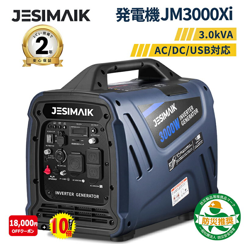 PowerArQ Inverter Generator 3100W (SC3000BM) 高出力・軽量コンパクト設計の高性能発電機 PowerArQ Inverter Generatorは、最大出力3100Wのパワーと重量わずか23kgの軽量コンパクト設計を両立。キャンプや車中泊、DIY、災害対策、工事現場まで、あらゆるシーンで頼れる電源サポートを提供します。 主な特長 家庭用エアコンや電子レンジも使える高出力 定格出力3050W、最大出力3100W。冷蔵庫や電子レンジ、電動工具、エアコンなど消費電力の高い家電にも対応。 持ち運びしやすい軽量設計 本体重量約23kg。上部にハンドル付きで車への積み込みや現場での移動もスムーズ。 15%負荷で20時間以上運転可能 容量6Lの燃料タンク搭載。15%負荷で約21時間、100%負荷でも約3.5時間の連続稼働。 豊富な出力ポートと安心の保護機能 AC100V、DC12V、USBポート搭載。正弦波出力でPC等の精密機器にも対応。過負荷保護・低オイル警告・過熱保護機能付き。 製品仕様 製品型番SC3000BM 最大出力3100W 定格出力3050W (3.05kVA) エンジン型式4ストローク OHV 強制空冷単気筒 排気量212cc 燃料タンク容量6L 連続運転時間約21時間(1/4負荷時) 周波数50Hz / 60Hz 切替式 波形正弦波 AC出力100V/20A×1口, 100V/15A×1口 DC出力12V/8.3A×1口 USB出力Type-A 5V/2.1A×1口 外形寸法530×310×450mm 重量23kg 防水防塵性能IP23 安全機能過負荷保護・低オイル警告・過温度保護 付属品 スパークプラグレンチ×1 プラスドライバー×1 120VDC バッテリー充電ケーブル×1 フレキシブルねじ込み式じょうご×1 日本語取扱説明書×1 保証・サポート 30日間 返品・交換保証 返金は原則として購入日から30日間に限り対応可能です。 2年間 製品保証 万が一、商品に不具合がある場合は、取扱説明書記載の連絡先か、購入履歴より当店までご連絡ください。保証期間は購入日から起算。非正規店舗での購入は保証対象外となります。 無期限カスタマーサポート 製品に関するご不明な点はいつでもサポートいたします。 メーカー希望小売価格はメーカーサイトに基づいて掲載していますご注意 楽天市場では、当店のみが正規販売店です。 当店以外の楽天市場の店舗で購入された場合、正規保証対象外となりますので、ご注意ください。 定格出力:3050W お気に入り登録すると楽天市場より通知が届きます お気に入りに登録する