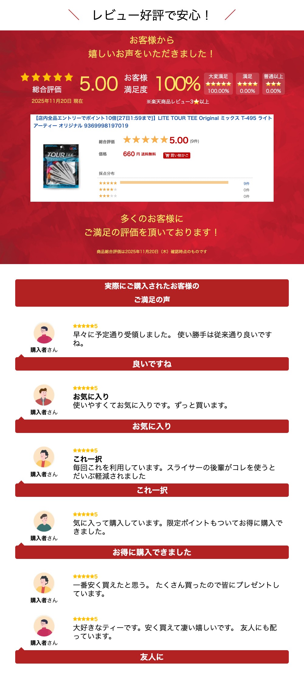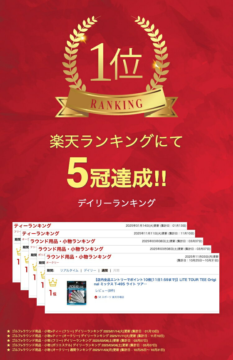 関連商品【店内全品エントリーでポイント10倍[27日1:59まで]】LITE ...【店内全品エントリーでポイント10倍[27日1:59まで]】LITE ...【店内全品エントリーでポイント10倍[27日1:59まで]】LITE ...660円660円660円TOUR TEE PLUS T-496ライト ツアーティープラス 高さ...Tour Tee PLUS LOW LAUNCH 4本入りツアーティー...【店内全品エントリーでポイント10倍[27日1:59まで]】LITE ...660円660円660円LITE TOUR TEE Pro リミテッドエディション T-489...LITE TOUR TEE MINI ミニ ミックス T-491-99...【店内全品エントリーでポイント10倍[27日1:59まで]】LITE ...660円660円660円【店内全品エントリーでポイント10倍[27日1:59まで]】LITE ...【5個セット】LITE TOUR TEE Original ミックス ...【3個セット】LITE TOUR TEE Original ミックス ...660円3,630円2,310円商品情報 ・カップ上の突起がボールとの摩擦を減らし、飛距離と方向性をアップ。 ・環境に優しい再生プラスチックを使用。 ・サイズ:長さ 80?、カップΦ19 ・パッケージサイズ:縦126×横101? ・材質:PC、ラバー ・内容量:5本 ・中国製 ・JAN:9369998197019 ■おすすめティー一覧 LITE TOUR TEE Original ミックス T-495 ライト ツアーティー オリジナル 9369998197019 LITE TOUR TEE Combo ミックス T-490 ライト ツアーティー コンボ 9369998042265 LITE TOUR TEE Combo リミテッドエディション T-490 ライト ツアーティー コンボ 9369998195473 LITE TOUR TEE Pro リミテッドエディション T-489 ライト ツアーティー プロ 9369998260898 LITE TOUR TEE Pro ブルーxグレー T-489 ライト ツアーティー プロ 9369998073061(4903487248902) エボルブゴルフ エポックティー Evolve Golf Epoch Tee 40本入り(70mmx30、38mmx10) エボルブゴルフ エポックティー Evolve Golf Epoch Tee 40本入り(70mmx30、38mmx10)US Flag