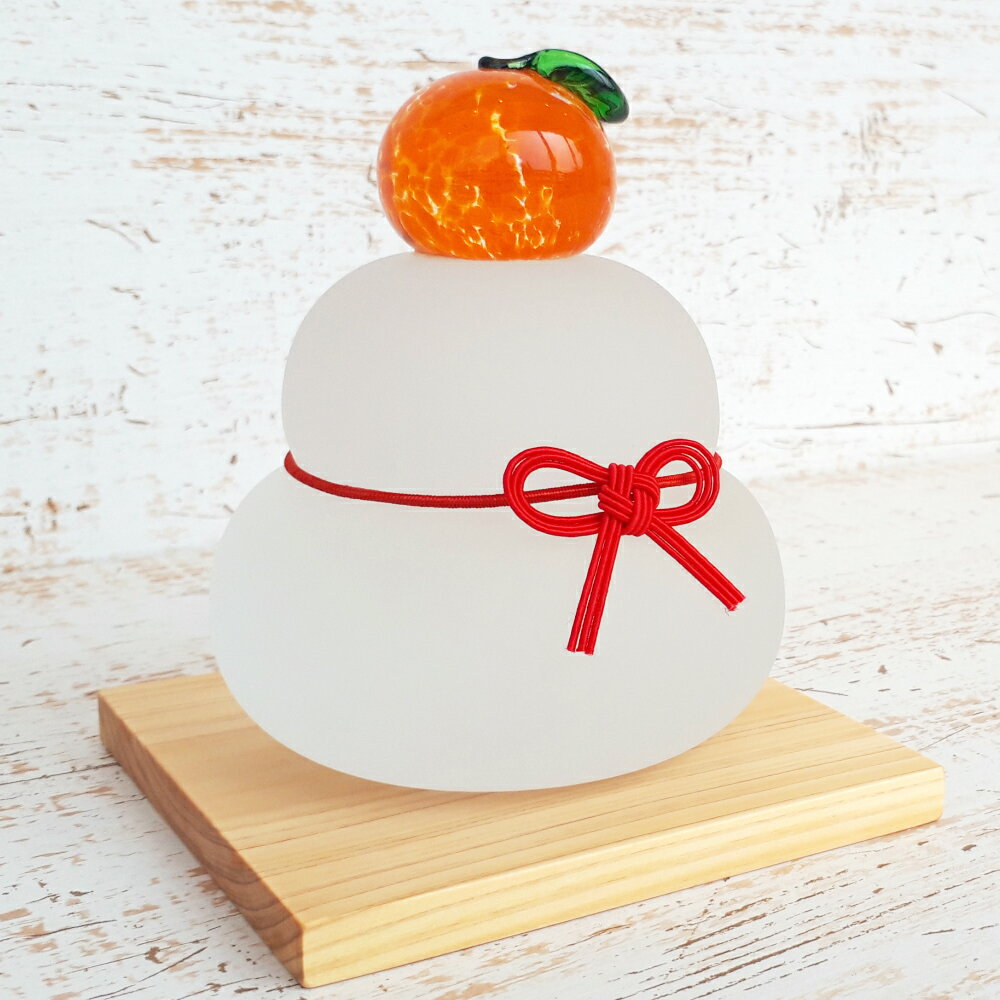 商品説明サイズ■(鏡餅)縦約8.5cmX横約8.5cmX高さ約10.5cm (檜板)縦約10cmX横約10cmX高さ約0.9cm■重量 850g前後(鏡餅約800g+檜板他約50g)■セット内容鏡餅1個、水引1個、檜板1枚■素材鏡餅/ガラス、水引/紙(絹巻)、檜板/木■電子レンジ×■食器洗浄機× ※ガラスはひとつひとつ制作していますので色の発色を含め、形もサイズも微妙に違います。また、ガラスの中に気泡が入ったり、制作過程で道具で触った跡や、吹き竿を切り離した跡などが残る場合があります。当店では、これらのことを手作りのガラスの表情であり個性と捉えていますので、予めご了承ください。 産地■日本/静岡県ガラス工房 CRAFTHOUSE 商品説明ガラス職人が、ひとつひとつ丹念に手作りで制作したガラスの鏡餅です。 お餅の乳白色と橙(ダイダイ)のオレンジ色のコントラストが美しく、それぞれがちょうどいい大きさ。お餅の部分はフロストガラスになっており、透過する光を柔らかく投影する透き通った白さは、お正月にふさわしい清々しさです。大サイズの鏡餅といっても、女性の手の平と同じくらいのサイズ。違和感なく他のインテリアとも馴染むけれど、しっかりと存在感もあるという程よい大きさです。そして何といっても重厚感が◎。ずっしりとした重さと高級感があります。 ちょこんと小ぶりな蝶結びの水引は、鏡餅との大きさのバランスが絶妙な可愛さ!敷板は温かみのある檜板を使用し、檜がほんのり薫る、今までにないナチュラルモダンな装いになりました。北欧インテリアとの相性も良く、写真のものが全てセットとなっていますので、届いてすぐにオシャレに飾っていただけます。 玄関先やリビング、職場では受付カウンターやレジの横など、ちょっとしたスペースにどうぞ。木漏れ日があたる場所や間接照明があたる場所などに飾っていただくと、フロストガラスならではの良さを感じていただけます。お世話になった方への贈答品として、また、友人、親世代、子ども世代、孫世代へのプレゼントにも喜ばれます。 ガラスなので毎年繰り返し使うことができ、お正月が来るのが待ち遠しくなる可愛さです!ご購入前にご確認下さいガラスは耐熱性ではございません。したがって熱湯や熱い料理等は製品を破損しますので、ご注意ください。1. 急激な温度変化に耐えられません熱湯、熱い料理、沢山の氷を一度に入れる、冷凍庫に入れる等の行為は、作品を破損させます。2. 手洗いと手拭きのすすめ食器洗浄機は熱湯、熱風による洗浄機能がありますので、お手入れには不向きです。3. 電子レンジの使用禁止急激に熱くなりますので、使用できません。4. 保管についてガラスはキズがつくと破損し易い性質があります。重ねたり、ガラス器同士など堅いものにぶつけたりしないように扱ってください。5. 定期的な洗浄のすすめガラス製品は長期間洗わないと、汚れが落ちにくくなったり、曇りがでてきたりします。適宜洗うようにしてください。ガラス職人が、ひとつひとつ丹念に手作りで制作したガラスの鏡餅です。お餅の乳白色と橙(ダイダイ)のオレンジ色のコントラストが美しく、それぞれがちょうどいい大きさ。お餅の部分はフロストガラスになっており、透過する光を柔らかく投影する透き通った白さは、お正月にふさわしい清々しさです。大サイズの鏡餅といっても、女性の手の平と同じくらいのサイズ。違和感なく他のインテリアとも馴染むけれど、しっかりと存在感もあるという程よい大きさです。そして何といっても重厚感が◎。ずっしりとした重さと高級感があります。ちょこんと小ぶりな蝶結びの水引は、鏡餅との大きさのバランスが絶妙な可愛さ!敷板は温かみのある檜板を使用し、檜がほんのり薫る、今までにないナチュラルモダンな装いになりました。北欧インテリアとの相性も良く、写真のものが全てセットとなっていますので、届いてすぐにオシャレに飾っていただけます。玄関先やリビング、職場では受付カウンターやレジの横など、ちょっとしたスペースにどうぞ。木漏れ日があたる場所や間接照明があたる場所などに飾っていただくと、フロストガラスならではの良さを感じていただけます。お世話になった方への贈答品として、また、友人、親世代、子ども世代、孫世代へのプレゼントにも喜ばれます。ガラスなので毎年繰り返し使うことができ、お正月が来るのが待ち遠しくなる可愛さです!