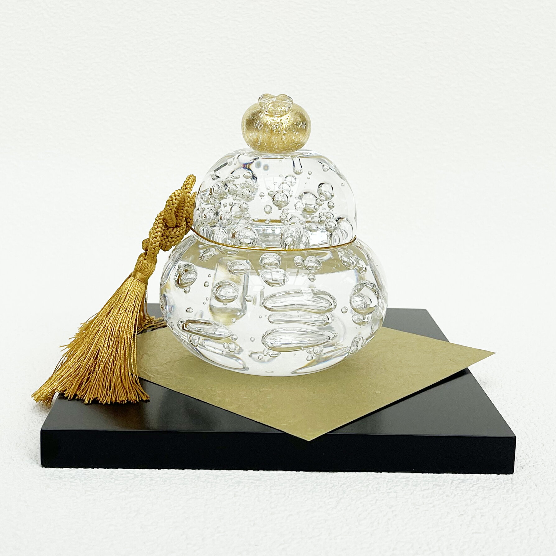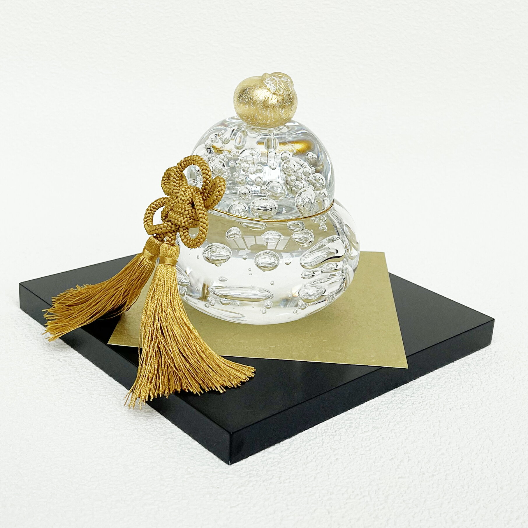 【BLACKFRIDAY】【10%OFF 12100円>10890円】【ポイント10倍】工房 CRAFTHOUSE ガラス製 鏡餅 水泡 (大)無垢 敷板 梅結び 金 組紐 房 飾り 金和紙付き 箱入り ガラス鏡餅