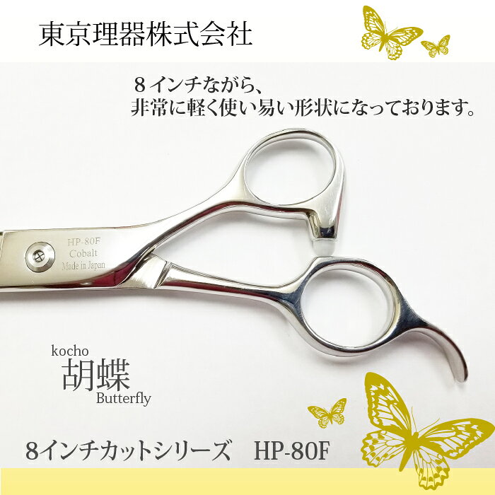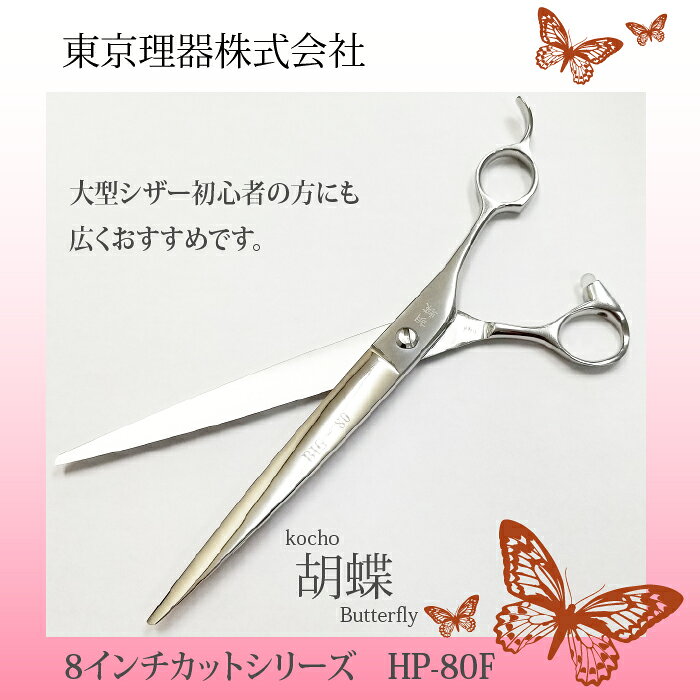 東京理器 胡蝶 HP-80F 無料研ぎ券・キョンセーム15cm・シザーリング・オイルペン付 トリミングシザーお手入れ用品のおまけ付 プロトリマー向けのペット用ハサミ 犬猫に カットシザー プロトリマー御用達、東京理器の胡蝶シリーズこのブランドは伝統美シリーズとして、高級シザーが中心です高い精度と耐久性を誇り、外観においても職人が隅々まで気を配って仕上げています----------------------------- 胡蝶 HP-80F-----------------------------サイズ:8inch全長 :194mm刃渡り:105mm重量 :78g指掛 :固定型刃型状:段刃材質 :コバルト材メーカー:東京理器株式会社ベースカットに胡蝶唯一の8インチ大型ですが、刃先の細さ、開閉感など繊細な感覚を取り入れ、女性や初心者にも使いやすいシザーです8インチながら、非常に軽く使い易い形状になっております長い刃渡りを活かしたカットや硬めの毛のカットにも大型犬をカットされるトリマーさんに人気です●無料研ぎ券・保証書付き※こちらのシザーの研ぎは、東京理器株式会社へ出して頂くことをおすすめします製造時に仕上げをおこなった職人が研ぎを行うことで、刃の角度等シザーの狂いをなくします●専用オイルペン・シザーリング・キャンセーム革(15×15cm)付き 2