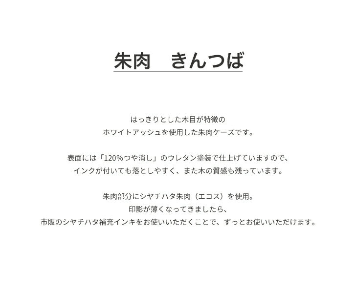 商品情報品 番km-67NA,BRサイズケース:Φ76mm×76mm×26mm盤 面:Φ53.5mm重 量100g材 質朱肉50号、ホワイトアッシュ色km-67NA:ナチュラルkm-67BR:ブラウン仕 様仕上げ:ウレタン塗装(ツヤ消し)フタ:かぶせ式備 考シヤチハタ社「朱肉(エコス)50号」使用【公式】KATOMOKU カトモク 朱肉50号 きんつば型 ナチュラル km-67 シャチハタ ホワイトアッシュ ナチュラル ブラウン 朱肉 四角 プレゼント ギフト 印章 木製 国内製造 はっきりとした木目 可愛いコンパクトな本格朱肉 はっきりとした木目が特徴のホワイトアッシュを使用した朱肉ケースです。(朱肉付き)表面には「120%つや消し」のウレタン塗装を施し、インクが付いても落としやすく、また木の質感も残しました。朱肉部はシヤチハタ朱肉(エコス)を使用していますので、印影が薄くなってきましたら、市販のシヤチハタ補充インキで補充いただくことで永くお使いいただけます。 7
