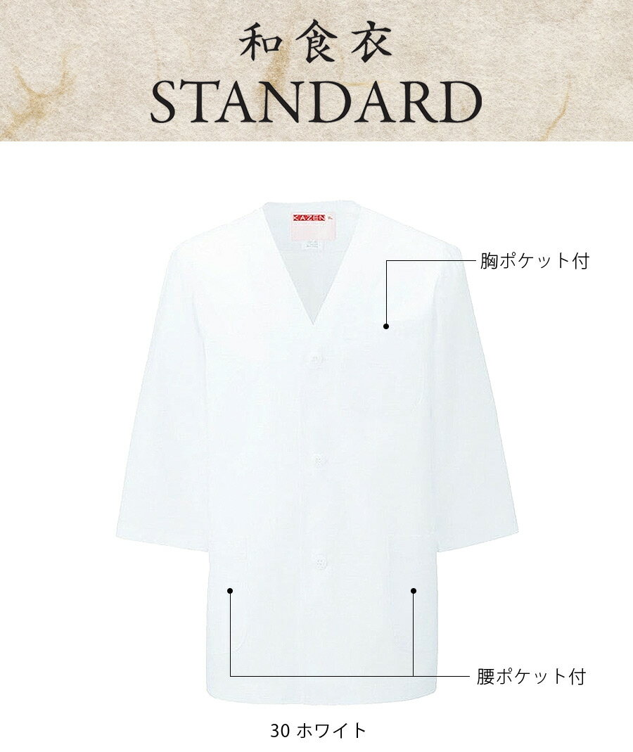衿なし調理衣 七分袖 カゼン 321-30 KAZEN 男女兼用 メンズ レディース 吸汗 制菌 厨房 調理白衣 和食 寿司 割烹 料亭 居酒屋 飲食店 制服