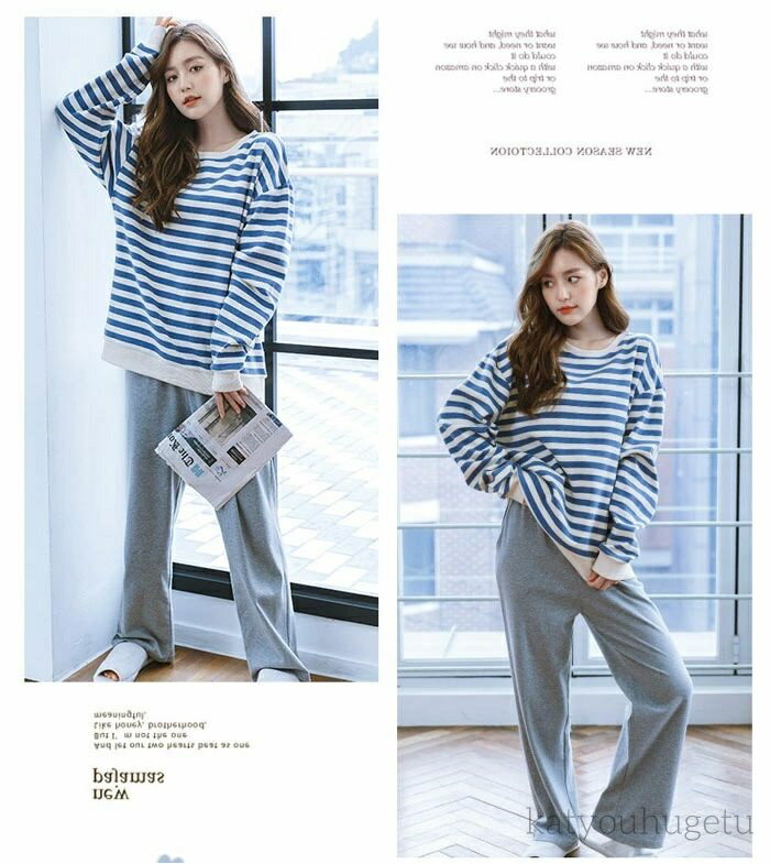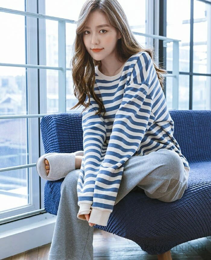 【送料無料】レディース ナイトウエア 2点セット パジャマ コットン 長袖 綿 コットン ボーダー 大きいサイズ 無地 可愛い おしゃれ 部屋