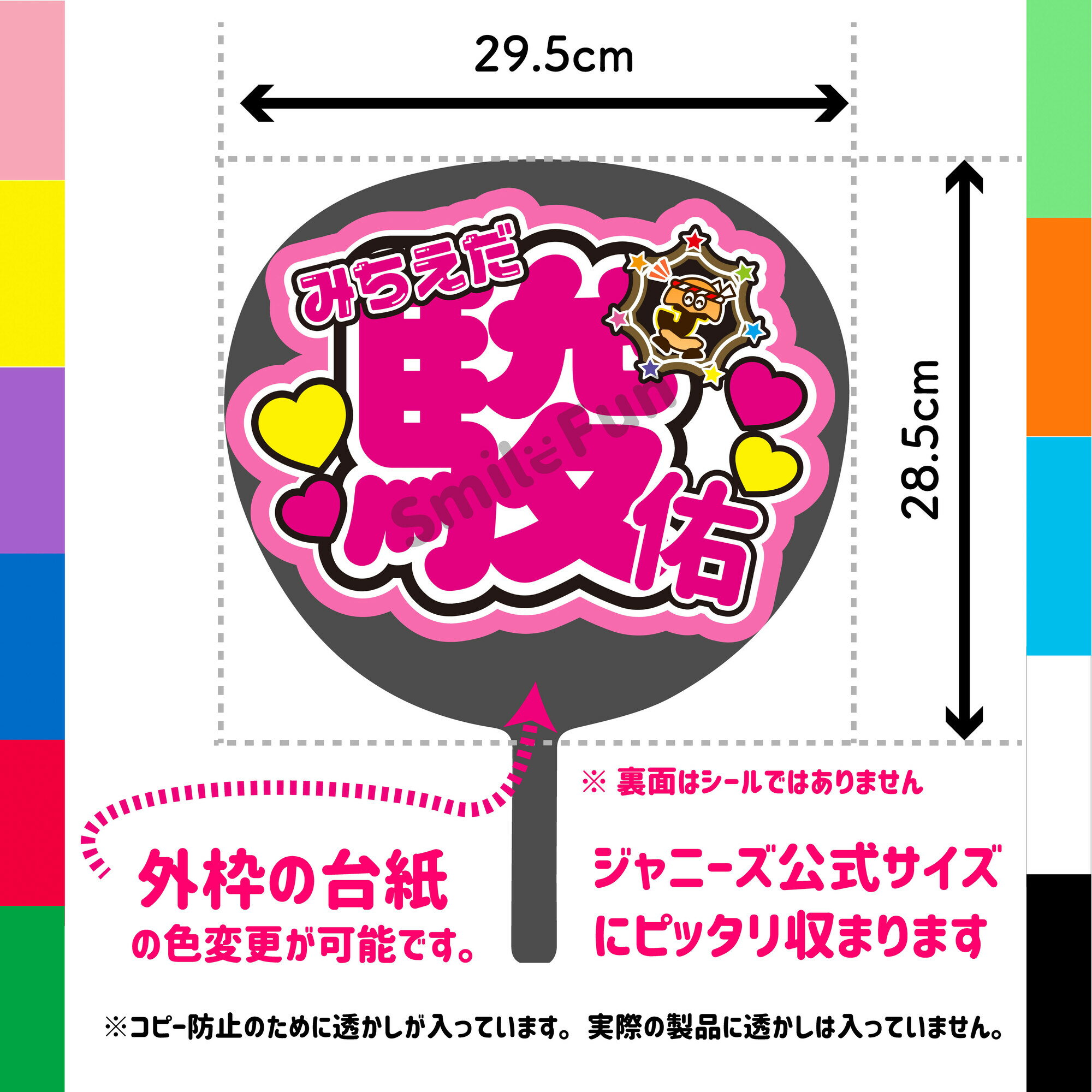 こちらの商品は【ジャンボうちわ本体は付属しておりません】 うちわの文字のみの販売ですのでご注意ください。 ジャンボうちわにぴったり収まるサイズになります。 13時までのご購入で当日発送いたします。(休業日を除く) 追跡のある日本郵便ゆうパケット発送になります。 (クリアファイルに入れて厚紙補強をして発送しております) SMILE FUNは「可愛く目立つうちわ屋さん」などのブランドを展開する「ファンサうちわ」のパイオニアです。 様々な種類のファンサうちわ、コンサートうちわを販売しています。 あなたのほしいファンサうちわは必ずSMILE FUNで見つかります。