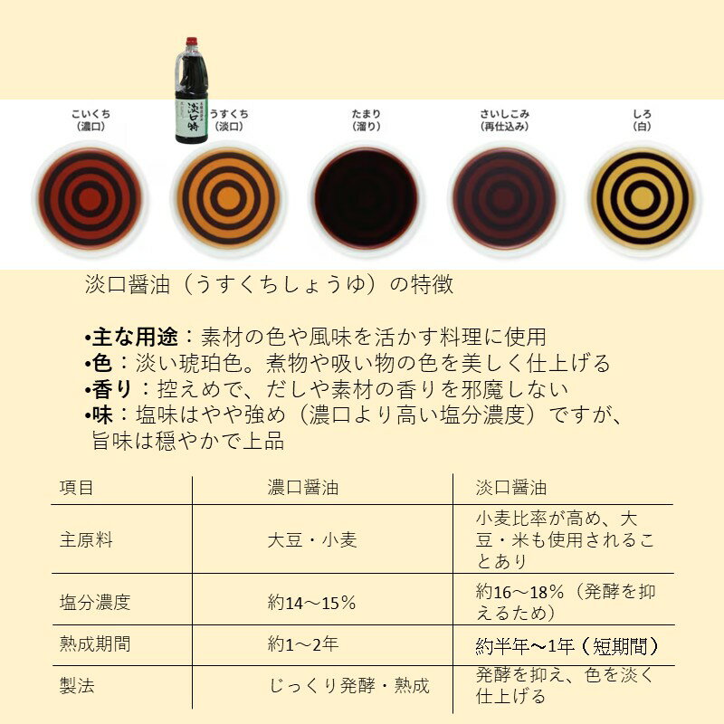 商品説明 業務用サイズの淡口醤油です。 JAS特級。 商品名 淡口特 1.8L×3本 1本はこちら 商品概要 原材料 食塩、小麦、脱脂加工大豆、ぶどう糖/アルコール、調味料(アミノ酸等)、ビタミンB1、甘味料(甘草) 保存方法 直射日光・高温をさけ保存 賞味期限 12か月 アレルギー表示 小麦、大豆 栄養成分表(15ml当り) 熱量 9Kcal たんぱく質 1.0g 脂質 0g 炭水化物 1.3g 食塩相当量 2.9g