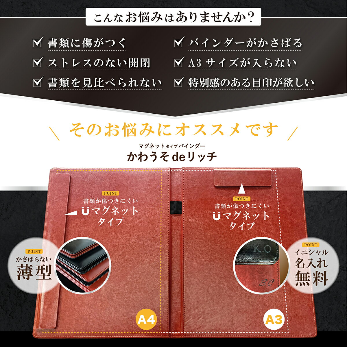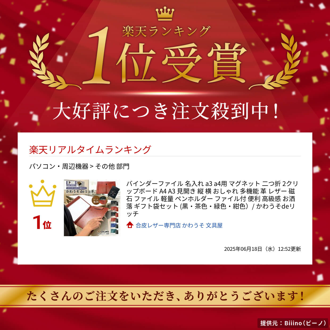 バインダーファイル 名入れ a3 a4用 マグネット 二つ折 2クリップボード A4 A3 見開き 縦 横 おしゃれ 多機能 革 レザー 磁石 ファイル 軽量 ペンホルダー ファイル付 便利 高級感 お洒落 ギフト袋セット (黒・茶色・緑色・紺色)/ かわうそdeリッチ