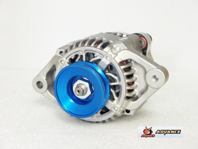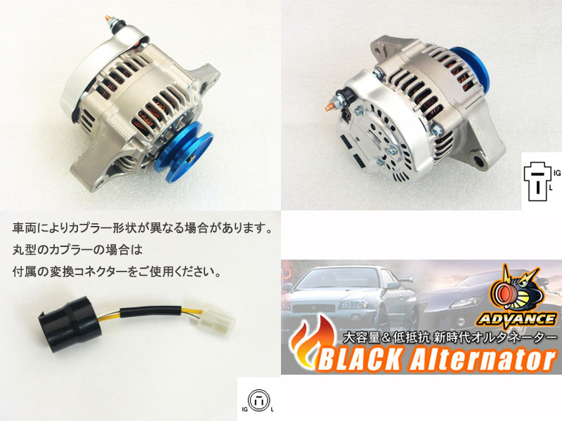 【適合車両】 ●車種: AZ-1 ●型式: PG6SA ●E/g型式: F6A 【商品説明】 ADVANCE High-Power Alternator アドバンス ハイパワー オルタネーター (ダイナモ) ○ハイパワーオルタネーター ・品番:KH-F6A-1V-C ・アルミプーリー(ブルー)付 ・発電量:65Amp ※車両によりカプラー形状が異なる場合があります。 丸型のカプラーの場合は付属の変換コネクターをご使用ください。 ☆軽量・低抵抗 新世代オルタネーター 車種別 純正交換タイプ ☆純正をはるかに上回る性能を発揮!☆ ■発電量が純正55Aから65Aへアップ 発電量のアップにより、安定した電気が供給されます。 ■低抵抗化によりエンジンパワー回復、レスポンス向上 オルタネーターの発電時の抵抗が軽くなるので、 エンジンパワーのロスが低減されます。 ※一年保証付 ※掲載画像はメーカーHP掲載の参考となります。 また、ブラウザ環境やメーカー商品改良などにより、 実際の商品色味・形状など異なる場合もございます。 ※取付の際の注意事項がある車種もございますので、 必ずメーカーHP等で車種別適合をご確認ください。 ※車種により純正品より少々重量が増す商品もございます。 ※お急ぎの方は必ず在庫のお問い合わせをお願いいたします。 【メーカーHP掲載 PRポイント】 「オルタネーター(ダイナモ)とは」のページで説明したとおり、 このパーツが車にとって欠かせないパーツでありながら、 同時にパワーロスの原因になっていることがわかってもらえたかな? しかし、そのことを逆に考えるとオルタネーター(ダイナモ)の抵抗を減らすことができれば、 パワーロスをぐっと低くおさえられるということがわかるはず。 低回転でも十分な発電量を得ることができれば、抵抗を大きくしないで済む。 それだけパワーロスも減るっていう図式が成り立つのだ。 ちなみに、発電量をアップするにはローターの回転数をあげる、ローターに流す電流を大きくする、 ステーターコイルの巻き数を増やすという3つの方法がある。 しかし、ローターの回転数を上げればいいんだけど、それはエンジン回転数に比例する部分。 発電のためにつねに高回転をキープするなんてのはありえないし、 発電量がアップしてもロスは全然変わらない。 プーリー比の変更も発電量はアップしても抵抗が増えるからダメだよね。 その高密度という部分に注目して作られているのが、 このブラックオルタネーターというアイテムの心臓部セグメントコンダクターコイルなんだ。 ※セグメントコンダクターコイルについては下で詳しく説明しています。 このブラックオルタネーターにも使われているステーターコイルの巻き線は一般的な丸断面ではなく、 角断面となっているのが大きな特徴。 角断面とすることで、隙間なく高密度に巻くことができるようになったということ。 つまり、ローターに流す電流(負荷)を減らしても、きちんと発電量を確保することが可能となって、 結果的にエンジンへの抵抗、パワーロスを減らすことに成功しているって訳なんだよね。 しかも、嬉しいことにこのブラックオルタネーターの発電効率がアップしたことによって、 同じ発電量を小さいもので得ることができるようになったのも注目したいポイント。 なんと、今回テストしたFD3S用はプーリー込みの状態で、 ノーマルに比べて約1.5kgもの軽量化に成功しているのだ。 ブラックオルタネーターの装着に関してはすべてボルトオンでOK。 車種によっては変換ハーネスが必要になる場合もあるが、 それも軽量なアルミプーリーと共にセットに含まれている。 今まであまり注目されることのなかったブラックオルタネーターだけど、 この抵抗を減らしてやることで実質的にパワーアップさせてやるという新発想。 コイツはかなり注目したい新しいチューニングって言えるんじゃないかな? ◎全国一律 送料無料!!(北海道・本州・四国・九州) ※沖縄県および離島は送料着払いとなります。 ※商品発送期間 ◎メーカー在庫が有る場合 注文確定(銀行振込は入金確認後)から1〜3営業日で発送となります。 ◎メーカー在庫が欠品場合 ご入金確認後の入荷ご予約にて納期が長期かかる場合があります。 決済確認後、当〜翌営業日までに改めて発送日のご連絡をさせていただきます。 ※お急ぎな方はご注文に必ず「納期問合せ」をお願い致します。 納期確認無き場合の納期遅延などに関するクレーム及びキャンセル等は 一切お受けできません。