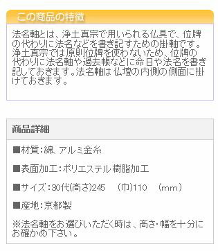 よく一緒に購入されている商品仏具 法名軸 みやび(茶表装・紺表装)50代1,980円仏具 法名軸 みやび(茶表装・紺表装)20代1,540円仏具 掛軸ピン 法輪 385円 法名軸とは、浄土真宗で用いられる仏具で、位牌の代わりに法名などを書き記すための掛軸です。浄土真宗では原則位牌を使わないため、位牌の代わりに法名軸や過去帳などに命日や法名を書き記しておきます。法名軸は仏壇の内側の側面に掛けておきます。 商品詳細 ■材質:綿、アルミ金糸 ■表面加工:ポリエステル樹脂加工 ■サイズ:30代(高さ)245 (巾)110 (mm) ■産地:京都製※法名軸をお選びいただく時は、高さ・幅を十分にお確かめ下さい。 法名軸 みやび(茶表装・紺表装) 単位mm 高 幅 おすすめ仏壇 豆 170 90 上置きタイプ 20代 195 90 上置きタイプ 30代 245 110 直置きタイプ 50代 280 130 直置きタイプ 60代 345 145 直置きタイプ 70代 385 170 大型仏壇 100代 420 192 大型仏壇 注意事項 ・ご覧のパソコンの環境により色が実際と多少異なる ことがございますのでご注意ください。 ・画像の商品は20代でございます。 ※ご不明な点がございましたら、お気軽にお問い合わせ下さい。 新着商品はこちら2025/10/23ペット用祭壇 仏具 コンパクト 『永遠の愛メモ16,500円2025/10/23ペット用祭壇仏具 コンパクト 『虹とクローバー5,720円2025/10/23ペット用祭壇仏具 コンパクト 『金襴おりんセッ3,740円2025/12/04 更新 仏像 掛軸 モダンミニ仏壇 モダン仏壇 位牌 仏具
