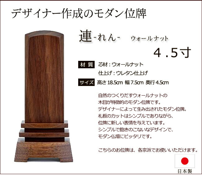 【ポイント5倍+クーポン!】 【位牌 名入れ 無料】 モダン位牌 連 れん(ウォールナット)4.5寸 (位牌 文字 込み) 【5年保証】 ( モダン 本位牌 お位牌 法要 ウォールナット モダン仏具 紫檀 板位牌 忌明け 家具調位牌 現代位牌 おしゃれ 仏具 戒名 名前入れ 文字彫り )