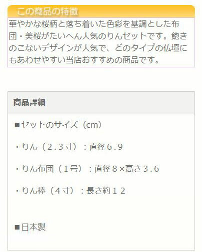 よく一緒に購入されている商品 仏具セット ミニ モダン仏具セット 『アイリ8,580円 仏具 雅りん棒台 朱・タメ 770円 仏具 『仏器 上金ハス』 550円 華やかな桜柄と落ち着いた色彩を基調とした布団・美桜がたいへん人気のりんセットです。飽きのこないデザインが人気で、どのタイプの仏壇にもあわせやすい当店おすすめの商品です。 商品詳細 ■セットのサイズ(cm) ・りん(2.3寸):直径6.9 ・りん布団(1号):直径8×高さ3.6 ・りん棒(4寸):長さ約12 ■日本製 ※ご覧のパソコンの環境により色が実際と多少異なることがございます。 ※ご不明な点がございましたら、お気軽にお問い合わせ下さい。 同シリーズおりんサイズ ■美桜りんのサイズ 2寸 → 直径 約6cm 2.3寸 → 直径 約6.9cm 2.5寸 → 直径 約7.6cm 2.8寸 → 直径 約8.4cm 3寸 → 直径 約9cm 3.5寸 → 直径 約10.5cm ◆関連商品 おすすめの関連商品はこちらからご覧いただけます! モダン仏具セット(単体)はこちら > おりん(単体)はこちら > 注意事項 ・お客様のモニターなどの違いなどにより、現物と色味が違ってみえる場合がありますので予めご了承下さい。 ・商品により寸法に多少の差異がありますので、予めご了承お願い致します。 類似商品はこちら 仏具 おりん 国産 おりんセット 『さくら柄6,050円 仏具 おりん 国産 おりんセット 『さくら柄5,280円 仏具 おりん 国産 おりんセット 『さくら柄5,280円 仏具 おりん 国産 おりんセット 『さくら柄4,840円 仏具 おりん 国産 おりんセット 『さくら柄5,720円 仏具 おりん 国産 おりんセット 『さくら柄8,580円 仏具 おりん 国産 おりんセット 『さくら柄5,500円 仏具 おりん 国産 おりんセット 『さくら柄3,960円 仏具 おりん 国産 おりんセット 『さくら柄9,460円2025/11/02 更新 モダン仏具セット(単体)はこちら > おりん(単体)はこちら >