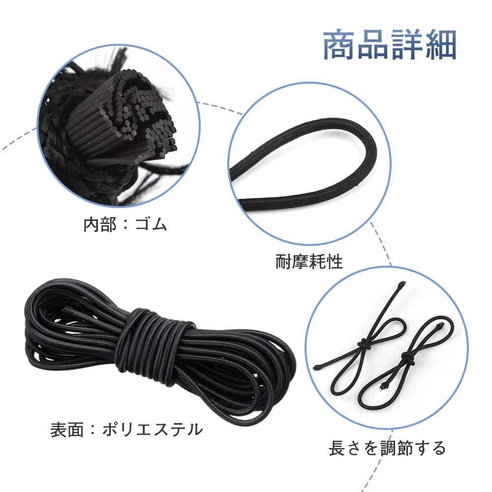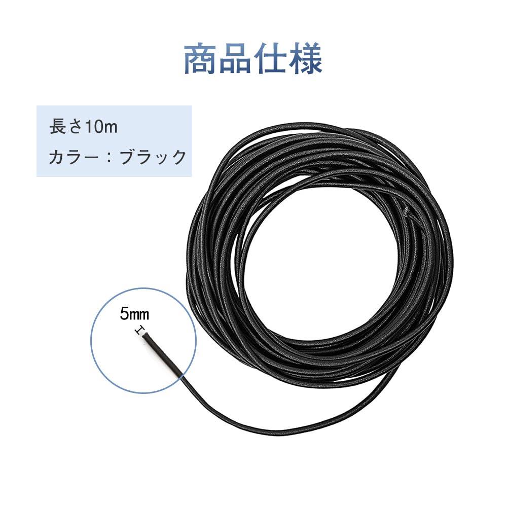 【商品仕様】幅5mm 長さ10m。カラー:ブラック。【高品質材質】表面:ポリエステル 内部:ゴム。ゴムロープは表面が耐摩耗性に優れ、内部は数十本のゴムが束になった構造で伸縮性が高いので。キャンプ パラコードは実用性に優れたいい商品でした。【耐久性優れた】パラコードの内芯は耐久性と強度に優れた100%ポリエステル製です。ポリエステルパラコードですから、伸び縮みがなく、型崩れしなく、頑丈で長持ちします。強度と耐久性に優れ、強い日差しと大雨時でも使えます。【調節】本製品のゴムロープはハサミで切って長さを調節する事が可能ですので。本製品を切った際には端をライターで炙って処理してください。そうする事で表面のポリエステルが溶けるので、ほつれず綺麗に処理する事が出来ます。ヘアアクセサリーのゴム紐にしたり、カーゴパンツやダウンジャケットなどの裾や袖のゴムがゆるゆるになったときの修理などにもお使い頂けます。【多用途】アウトドアなど様々なシーンで大活躍してくれます。リュックや荷物、アウトドアテントなどの修理で力になれます。アウトドア、キャンプ、サバイバルなどに最適です。【多用途】アウトドアなど様々なシーンで大活躍してくれます。リュックや荷物、アウトドアテントなどの修理で力になれます。アウトドア、キャンプ、サバイバルなどに最適です。
