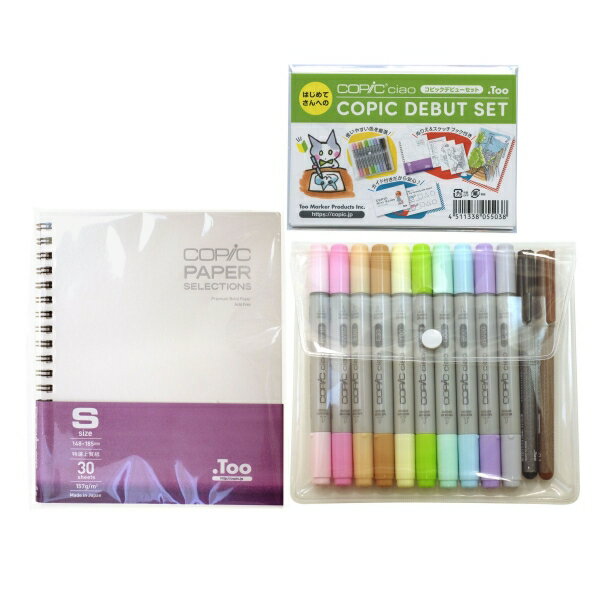 コピックを始めてみたい、再スタートしたい方にぴったりのセット「コピックチャオ デビューセット」。数多いコピックの色の中から、初心者に使いやすい色組と、マルチライナー、ぬり絵、さらにかわいいイラストによるコピックミニガイドなど、始めるのに必要なアイテムがセットされています。「コピックって色が多すぎて何色から買えばいいかわからない」という方におすすめです。セット内容:・コピックチャオ10色(BV00/RV02/RV10/Y00/YG23/G00/B00/E00/E33/C-2)・コピックマルチライナー ブラック 0.1mm・コピックマルチライナー セピア 0.1mm・コピックミニガイド・コピックスケッチブック Sサイズ*コピックチャオ初めてコピック製品を買う方向けの、購入しやすい安価なエントリーモデル。書き味や色味の品質はコピックスケッチと同一です。カラーレスブレンダーを含め180色のカラーバリエーションを誇ります。別売のバリオスインク(補充インク)によりインク補充ができ、ペン先も交換可能です。サイズ:縦=160mm 横=200mm 厚さ=25mm商品番号120807商品名コピックチャオ コピックデビューセット イラスト カラーペンJAN4511338055038メーカー.Too/トゥーメーカー品番12503037色違い・柄違いの商品⇒ 色違い・柄違いの商品をすべて確認する【.too/トゥー】コピック チャオ デビューセットを確認する600000015920: 200000002014:
