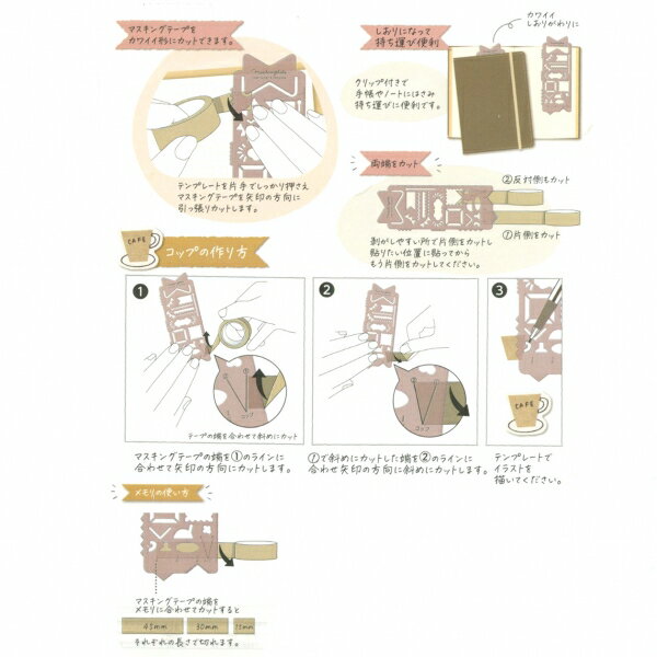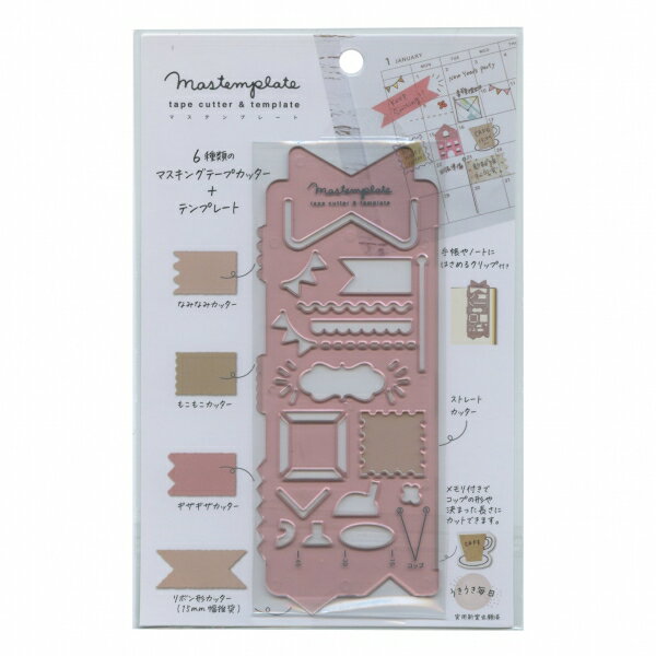 マスキングテープをかわいい形にカットしたり、イラストを描けるテンプレートです。テンプレートのフチが6種類のマスキングテープカッターになっておりマスキングテープを飾り切りすることができます。カットしたマスキングテープやその周辺にテンプレートでイラストを追加することで、かわいくデコレーションすることができます。リップ付きなので手帳やノートに挟み持ち運びに便利です。・15mm幅のマスキングテープ推奨サイズ:縦=150mm 横=60mm 厚さ=2mm商品色傾向:ピンク 表紙パターン:リボン商品番号158797商品名マステンプレート 定規 飾り切り【リボン】人気 マスキングテープカッターJAN4901478193132メーカークツワメーカー品番DE011A色違い・柄違いの商品⇒ 色違い・柄違いの商品をすべて確認する【クツワ】マステンプレート 定規 飾り切り 人気 マスキングテープカッターを確認する600000023564: 200000004204: