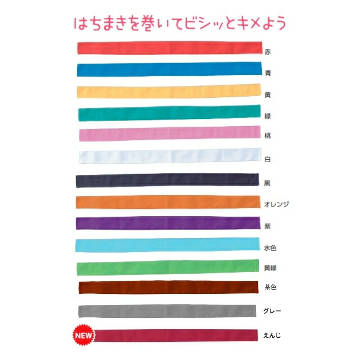 クラスや団体のカラーに合わせて!使いやすい綿素材のはちまき! カラーバリエーションが豊富な綿素材のはちまきです。しっかり巻けて、団体イベントにおすすめな定番アイテムです。丈夫で扱いやすい綿素材です。綿素材で肌あたりもやさしく、通気性に優れているので、長時間の装着も快適です。カラーが豊富なので、クラスやチーム、グループごとに色分けできます。運動会、発表会、イベントなど幅広いシーンで使えます。 サイズ/巾約40mm×1.1m 10本組 材質/綿100% はちまき1本売りはこちら! お得!はちまき30本売りはこちら! なが〜いロングはちまきはこちら!イメージカラーに合わせて一致団結! はちまきのバラ売りはこちら! なが〜いロングはちまきはこちら!