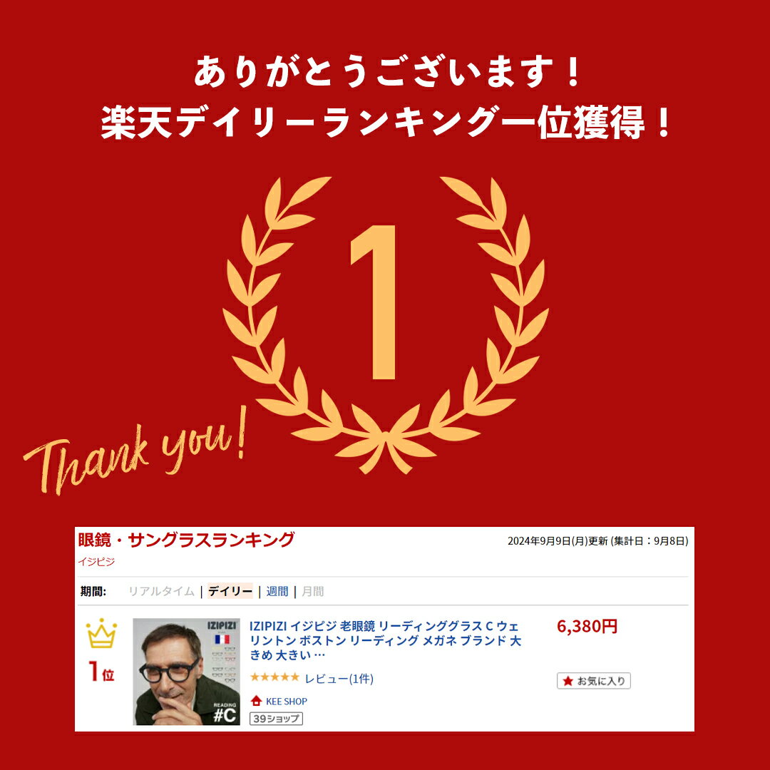 ZIPIZI(イジピジ) IZIPIZI READING #C IZIPIZI(イジピジ)がリリースした老眼対策のメガネ、READING(リーディング)モデルです。 40歳頃を境に始まりだすと言われる老眼。せっかくなら老眼対策もおしゃれにしたいもの。 そんな方にぴったりな老眼鏡(リーディンググラス)です。 度数は+1.0、+1.5、+2.0、+2.5、+3.0と豊富な5種類をラインナップ。 #Cはボストンフレームとウェリントンフレームの良いところを融合させたフレーム。 クラシックなボストンと顔なじみの良いウェリントンが合わさり、新鮮な魅力が生まれます。 比較的どんな輪郭でも合う形なので、フレーム選びに悩まれている方におすすめです。 また、フレームが太めに作られているため、マットフレームの滑らかな質感や、色柄がきちんと表現されているのが特徴的です。 ITEM INFO ブランド IZIPIZI(イジピジ) 「お客様の生活を一変させる老眼鏡」を理念に掲げ、2010年パリで誕生したメガネブランド。フランス、リヨン出身の3人のデザイナーが、読書用メガネの置き場を探して常に奮闘している親の姿を見て、 誰もがいつか老眼になっていくのだということを実感。その時の想いからスタイリッシュでカラフル、ファッショナブルで心が踊るようなリーディンググラスやサングラスを作り続けているアイウェアブランドです。 商品名 IZIPIZI READING #C リーディンググラス 老眼鏡 材質 フレーム/プラスチック、レンズ/プラスチック 生産国 台湾 カテゴリーから探す ブランド IZIPIZI(イジピジ)一覧から探す アイテム サングラス一覧から探す 新商品 新商品一覧から探す 商品の特徴 シーズン 春 夏 秋 冬 通年 オールシーズン 対象 メンズ レディース 主婦 女性 OL 男 男性 紳士 社会人 老人 おじいちゃん おばあちゃん 大人 シニア 夫 妻 30代 40代 50代 60代 70代 用途 老眼 デスクワーク 仕事 ビジネス スマホ スマートフォン タブレット テレワーク ゲーム ベッド 布団 寝る前 読書 キーワード 近くが見えにくい メガネ 度数 +1.0 +1.5 +2.0 +2.5 +3.0 カラー ゴールデングリーン フローズンブルー ハバナ イエロー ピンク レッド カーキグリーン グリーン ブルートータス ライトトータス トータス ネイビーブルー ブラック TORTOISE LIGHT TORTOISE BLUE TORTOISE BLACK NAVY BLUE YELLOW HONEY KAKI GREEN GREEN PINK RED Golden Green Frozen Blue Havane テイスト シンプル モダン カジュアル おしゃれ カラフル シーン プレゼント ギフト お祝い 贈り物 贈りもの 贈答 贈答品 お返し 返礼品 クリスマス クリスマスプレゼント クリスマスギフト 誕生日 誕生日プレゼント 記念日 記念 敬老の日 結婚記念日 成人祝い 就職祝い バレンタイン バレンタインデー ヴァレンタイン ヴァレンタインデー ホワイトデー 還暦祝いおしゃれな老眼鏡 IZIPIZI(イジピジ)がリリースした老眼対策のメガネ、READING(リーディング)モデルです。 40歳頃を境に始まりだすと言われる老眼。せっかくなら老眼対策もおしゃれにしたいもの。 そんな方にぴったりな老眼鏡(リーディンググラス)です。 度数は+1.0、+1.5、+2.0、+2.5、+3.0と豊富な5種類をラインナップ。 #Cはボストンフレームとウェリントンフレームの良いところを融合させたフレーム。 クラシックなボストンと顔なじみの良いウェリントンが合わさり、新鮮な魅力が生まれます。 比較的どんな輪郭でも合う形なので、フレーム選びに悩まれている方におすすめです。 また、フレームが太めに作られているため、マットフレームの滑らかな質感や、色柄がきちんと表現されているのが特徴的です。 軽量で丈夫なポリカーボネイト製フレームは、長時間かけていても快適な掛け心地です。 お手頃な価格帯なのも魅力の一つ。 自分へのご褒美はもちろん、ギフトにも最適です。 初めてアイウェアを購入される方にも、ぜひお試しいただきたい1本です。 DETAILS ITEM INFO ブランド IZIPIZI(イジピジ) 「お客様の生活を一変させる老眼鏡」を理念に掲げ、2010年パリで誕生したメガネブランド。フランス、リヨン出身の3人のデザイナーが、読書用メガネの置き場を探して常に奮闘している親の姿を見て、 誰もがいつか老眼になっていくのだということを実感。その時の想いからスタイリッシュでカラフル、ファッショナブルで心が踊るようなリーディンググラスやサングラスを作り続けているアイウェアブランドです。 商品名 IZIPIZI READING #C リーディンググラス 老眼鏡 材質 フレーム/プラスチック、レンズ/プラスチック 生産国 台湾