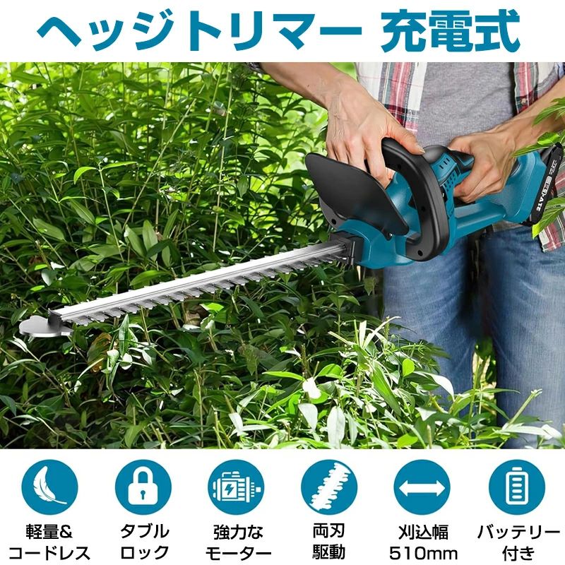 商品情報【大容量バッテリー付き&マキタ18Vバッテリー対応】大容量リチウムイオンバッテリー付きなので、十分に作業できます。マキタ18VバッテリーBL1820b BL1830 BL1840 BL1850などに対応できます。電源コードを接続せずに充電して使用できるため、使用場所を選らず、いつでもどこでも使いたい時に使えます。 【軽量&コードレス】ヘッジトリマーは人間工学に基づく設計されており、手首の曲がりを防ぎ、最適なグリップと角度を採用されます。本体のみ約3KGで、長時間の使用でも疲れにくく、女性や初心者でも簡単に庭木の剪定ができます。コードレスで、持ち運びやすく、電源コードを接続せずに充電して使用できます。 【ハイパワー&高硬度両刃駆動】強力なモーターと切れ味良いダブルブレードが搭載し、回転数が約1600回/分の強い力を発揮します。最大切断径18mmで、直径18mm の枝を切ることができます。SK5高炭素鋼から鍛造される刃は硬くて錆びにくい。刈込幅510mmの両刃駆動の設計で、作業効率を大幅に向上させることができます。 【安全ロックボタン&低騒音】円型ロックボタンが付きなので、ヘッジトリマーを開始する前に2つのスイッチを同時に押す必要があるため、誤操作を防止できます。低騒音、低振動の設計で、家族や近所に騒音の迷惑かけません。他のモデルよりも静かになります。 【広範囲をやにわに刈れる】刈り込み幅510mmのロングブレードです。植木や生垣の剪定をする、また下草を刈ると、高い所から低い所まで用途は様々。刃をゆっくり移動させるだけで、生垣の上面・側面などの広範囲を一気に刈れるので、均一で美しく仕上がり、時間の節約もできます。