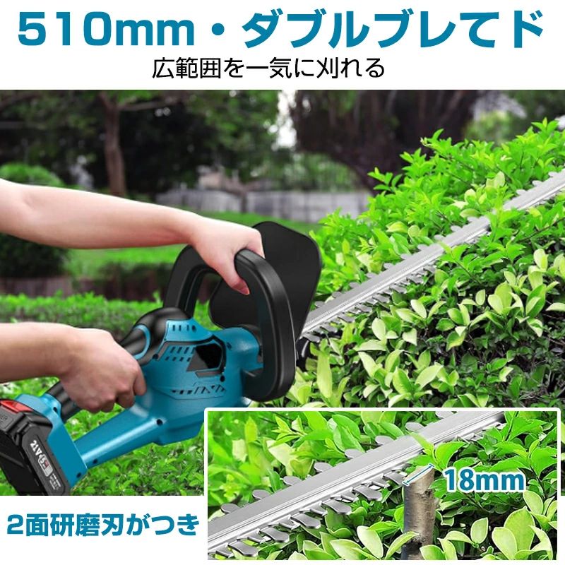 ヘッジトリマー 充電式 生垣バリカン ガーデントリマー コードレス 電動工具 刈込幅510mm 最大切断径18mm 両刃駆動 庭木剪定 枝切り 垣根 刈り込み機 ガーデンバリカン 庭木バリカン 軽量 低騒音 大容量バッテリー付き マキタバッテリー対応