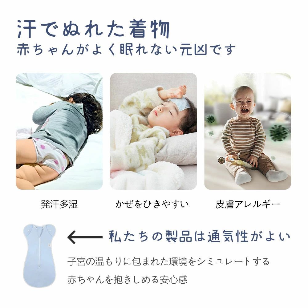 ベビー おくるみ スワドル 赤ちゃん 無地 ベビー寝袋 ベビーブランケット 天然コットン 夜泣き対策 赤ちゃん布団 出産祝い 出産準備 寝かしつけ スリーパー 安眠 熟睡 着るおくるみ かわいいおくるみ スワドル ブランケット 肌に優しい ベビーカーの日除けに最適この商品のイチオシポイント・ すやすや眠れる ・ 夜泣き対策に最適 ・ 人体に無害の染料を使うこんな方にぜひオススメです!・ 可愛い新生児 ・ モロー反射を抑制し ・ 赤ちゃんがリラックスできるショップからのメッセージ独自の生地配合:綿100% のスワドル では、脱臼する恐れがあるため、GUSUMIN は安全かつ ママの抱っこを再現 するべく、伸縮性 を増し綿95%、ポリウレタン5%と独自に配合した生地を採用。 ママの抱っこを再現:赤ちゃん が 安心 できるように生地感や 密着性 、着用時に 落ち着く Cカーブ になるよう設計致しました。 おむつ交換のしやすさ:従来品ではチャックの位置が高すぎるため、おむつ交換 がしにくいというお悩みがあり、GUSUMINではチャックの位置を下げおむつ交換をしやすいように改良を加えました。