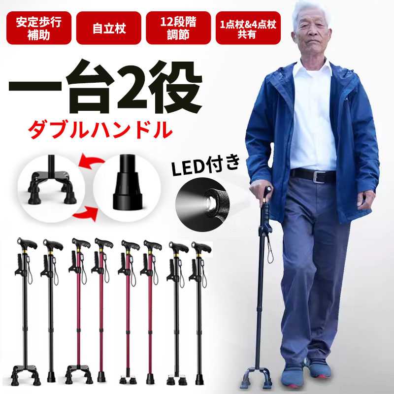 かるがもE 4点DX伸縮S.M兼用 ブラック ●設置面が広いので、安定しやすいステッキです。 【 安定しやすい 】先ゴムは4点式なので地面との設置面が広く、体を安定して支えます。また、斜めから地面を突いてもしっかり地面を捉え続けます。 【 手を離しても倒れない 】自立可能なので、手を離しても倒れません。(※経年劣化や使用状況により、自立しなくなる場合がございます) 【 握りやすい 】グリップは、握りやすく疲れにくい形状です。 カラーブラック サイズ長さ:(約)75〜97.5cm(10段階/2.5cm)グリップ長さ:(約)12.3cmベース部:(約)10cmパイプ径:(約)上部:1.9cm 下部:1.6cm 重量(約)435g 適応ゴムチップ内径(約)1.6cm 材質グリップ:ポリプロピレン、シャフト:アルミ、ストラップ:ナイロン、先ゴム:合成ゴム 生産国台湾 関連キーワード:介護用品 介護杖 歩行補助 ステッキ つえ おしゃれ 4点杖