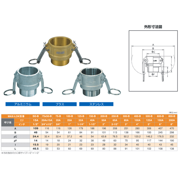 レバーカップリング 11/4インチ 32A MAX-B オスネジ型カプラー(メス×オスネジ) アルミニウム製 マックスロック カムロック