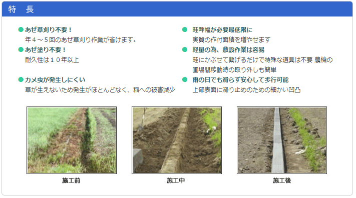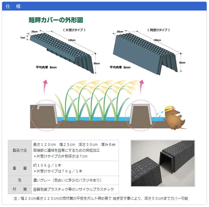 ■特徴 ●稲作農家の強い味方!! ●全国の田んぼでお使い頂いております。 ●弊社の『畦畔(あぜ)カバー』は、敷設の簡単なリサイクルプラスチック製です。 ●頑丈な作りになっているため、内部に土がない状態で人が乗っても歪むことはありません。 ●農作業の大変な軽減になったと大好評を頂いております。 ●各地の農業試験場でも採用頂いております。 ■用途 ●年4〜5回のあぜ草刈り作業が省けます! ●耐久性は10年以上! ●カメ虫が発生しにくい!草が生えないため発生がほとんどなく、稲への被害減少! ●畦畔幅が必要最低限に!実質の作付面積を増やせます! ●軽量の為、敷設作業は容易! ●雨の日でも滑らず安心して歩行可能! ■仕様 ●長さ:1,200mm ●幅 :250mm ●深さ:300mm ●厚み:8mm ●重量:約10.0kg/1本 ●色 :濃いグレー(色合いに多少のバラツキがあります) ●材質:容器包装プラスチック等のリサイクルプラスチック 注:幅23cm長さ120cmの同材質の平版をボルト締め等で 継ぎ足す事により、深さ50cmまでカバー可能★まとめ買いでお得です!★ ※30本以上のご注文はこちらから ※10本セットのご注文はこちらから ※20本セットのご注文はこちらから ■特徴 ●稲作農家の強い味方!! ●全国の田んぼでお使い頂いております。 ●弊社の『畦畔(あぜ)カバー』は、敷設の簡単なリサイクルプラスチック製です。 ●頑丈な作りになっているため、内部に土がない状態で人が乗っても歪むことはありません。 ●これで面倒な畦(あぜ)塗りや畦草刈から開放! ●農作業の大変な軽減になったと大好評を頂いております。 ●各地の農業試験場でも採用頂いております。 ■用途 ●あぜ草刈り不要!年4〜5回のあぜ草刈り作業が省けます! ●あぜ塗り不要!耐久性は10年以上! ●カメ虫が発生しにくい!草が生えないため発生がほとんどなく、稲への被害減少! ●畦畔幅が必要最低限に!実質の作付面積を増やせます! ●軽量の為、敷設作業は容易!畦にかぶせて繋げるだけで特殊な道具は不要!農機の圃場間移動時の取り外しも簡単! ●雨の日でも滑らず安心して歩行可能!上部表面に滑り止めのための細かい凹凸! ■仕様 ●長さ:1,200mm ●幅 :250mm ●深さ:300mm ●厚み:8mm ●重量:約10.0kg/1本 ●色 :濃いグレー(再生品につき色合いに多少のバラツキがあります) ●材質:容器包装プラスチック等のリサイクルプラスチック 注:幅23cm長さ120cmの同材質の平版をボルト締め等で 継ぎ足す事により、深さ50cmまでカバー可能 ※重量物になりますので配達地域によっては別途送料及び配達不可能な場合がございます。 ※こちらの商品は個人宅への配達はできませんので、法人様のご住所にてご注文願います。 検索用:再生プラスチック 再利用プラスチック あぜカバー 農業用品