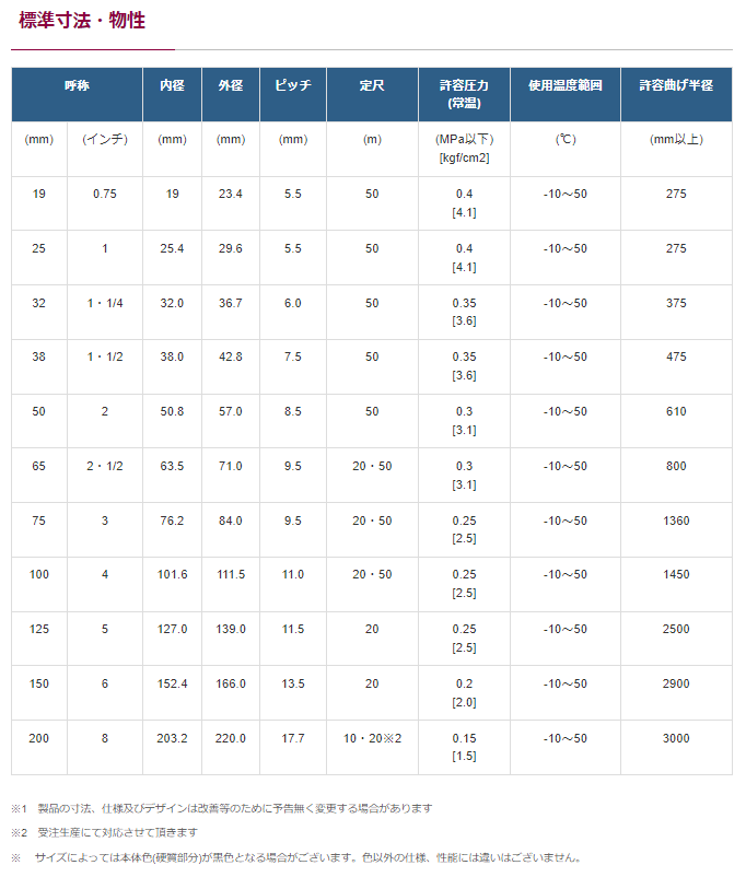 ■特徴 ●軟質部が透明のため輸送物の確認が可能です。 ●V.S.-C3型に比べて質量が約5%〜15%軽量化 ●内外面とも平滑で、持ち運び、移動もスムーズに行なえます ■用途 ●一般デリバリー・サクション用 ●工業用、灌漑用、土木現場の吸・排水用 ■仕様 ●型式:VS-CL ●呼称 : 125mm/5インチ ●内径×外径×ピッチ(mm): 127.0×139.0×11.5 ●許容圧力(常温)(Mpa以下)[kgf/2]:0.245[2.5] ●使用温度範囲(℃):−10〜50 ●許容曲げ半径(mm以上):2500 ※カナフレックスの商品欠品時は他のメーカーの同等商品にて対応させていただきます。 メーカー:カナフレックス タイガースポリマー エム・アイ・フレックス