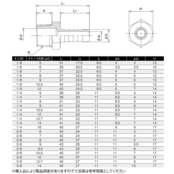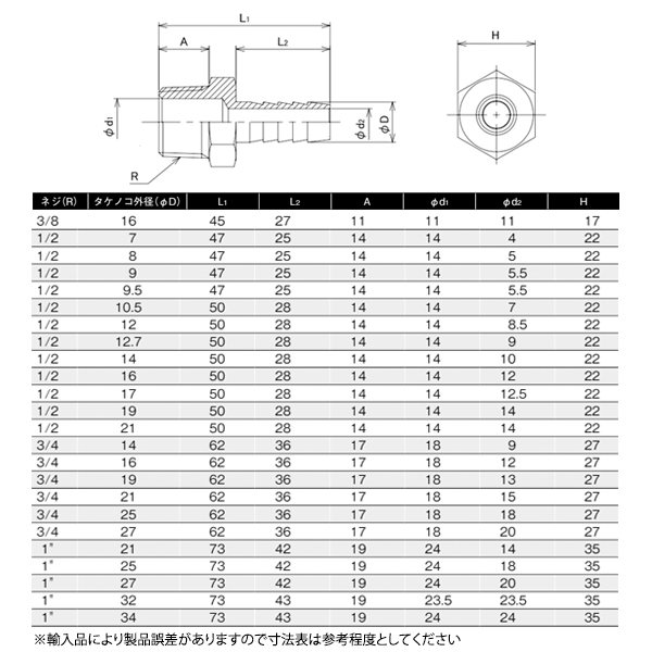■特長 ●テーパおねじ(R) ●豊富なラインナップで様々なホースに接続可能! ■仕様 ●ネジサイズ:R3/8(テーパー) ●対応ホース内径:16mm ●材質:真鍮 ●全長:45mm ●タケノコ長さ:27mm ●ネジ長さ:11mm ●ネジ内径:11mm ●タケノコ内径:11mm ●六角対辺:17mm 【注意事項】 ※必ずホースバンド等で固定してください。