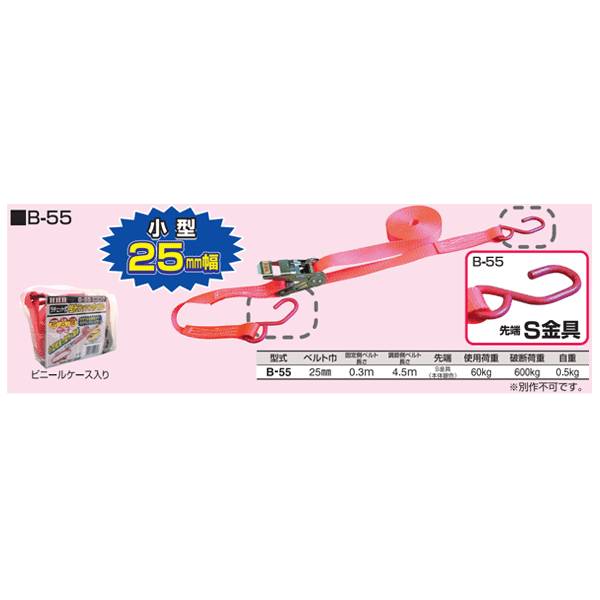 ■特長 ●あらゆる貨物の荷締め、結束、固定作業にご使用ください。 ●物が傷つかず、安定した荷締めができます。 ●操作が簡単で、能率的な荷締めができます。 ■仕様 ●型式:B-55 ●ベルト巾:25mm ●固定側ベルト長さ:0.3m ●調節側ベルト長さ:4.5m ●先端:S金具(本体銀色) ●使用荷重:60kg ●破断荷重:600kg ●自重:0.5kg