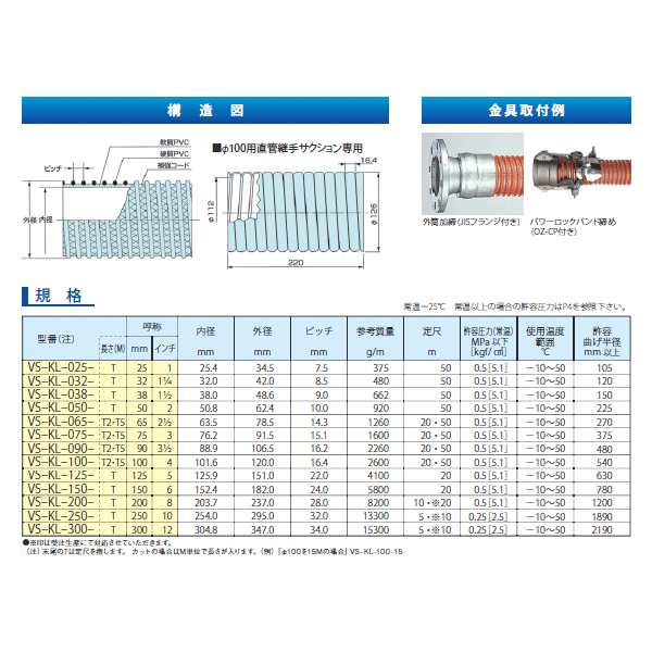 ■特徴 ●補強コード入りで最大許容圧力0.490MPa耐圧性能をそなえています ●軽量でフレキシブルなホースです ●V.S.ホースの耐圧タイプです ■用途 ●一般用デリバリー・サクション用 ●水中ポンプの立上り、急傾斜、ホースの吊り下げ状態などの用途に ●ダンバー車のサクション用に ■仕様 ●呼称:50 ●内径(mm):50.8 ●外径(mm):62.4 ●ピッチ(mm):10 ●参考質量(g/m):920 ●許容圧力(MPa以下)[kgf/cm2]:0.49[5.0] ●減圧変形温度(-0.098MPa時):70 ●許容曲げ半径(mm):225 検索用:カナフレ kanaflex 耐圧ホース 工業用 土木用 50径 50×1m