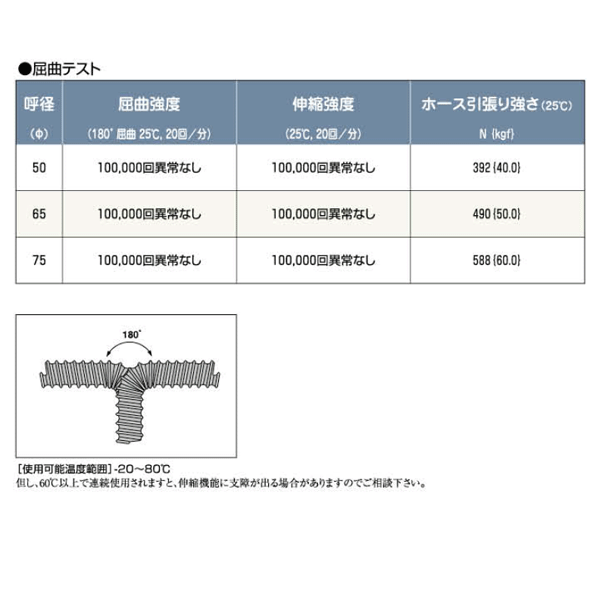 ■特徴 ●伸縮自在で、収納性に優れ保管が便利です。又、在庫のスペースが少なくてすみ、場所をとりません。(縮み比1/3~1/4) ●ホースの輸送費が少なくてすみ、経済的です。 ●従来のダクトホースの重量の半分以下です。(当社比) ●軽量かつ自在に曲げられるので、工事も容易です。 ●ホースがあらゆる方向に自在に曲げられます。そのためエルポカフスの必要がありません。 ■用途 ●スポット冷暖房用、空調用。 ●室内の送排気用。 ●塗装、ガス抜きの排気用。 ●気体輸送(温風を含む)用。 ●その他色々な形に変形できますので、インテリアデザイン用にもご利用できます。 ■仕様 ●呼称(φ):38 ●内径(mm):37.5 ●外径(mm):41.5士0.8 ●ピッチ(mm):9.5 ●許容圧力(20℃)MPa以下/[kgf/cm2以下]:0.018[0.18] ●許容減圧力(20℃)KPa以下/[mmHg以下]:-17.0[-130] ●許容曲げ半径(mm以上):30 ●参考質量(g/m):140