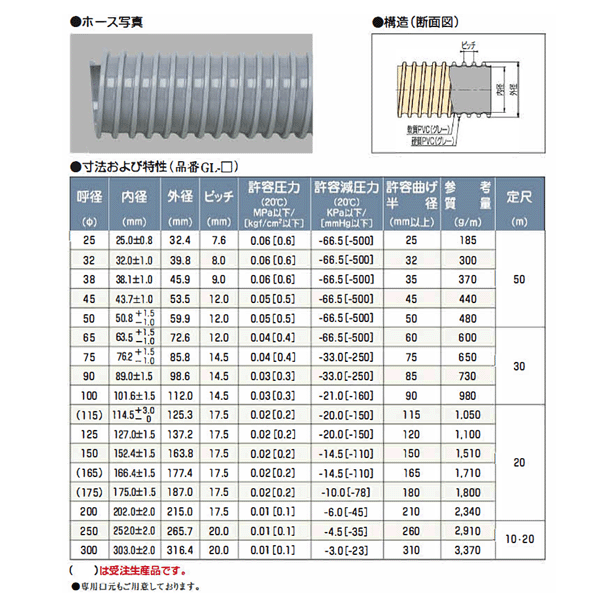 ■特徴 ●軽量で持ち運びが簡単です ●屈曲性に富んでいます ●酸、アルカリ等の耐薬品性に優れています ●通気抵抗が少ないので高い輸送能力が得られます ■用途 ●空調送風用 ●粉状粒状のものの集塵機器に適しています ●木工機器用、散粉機用、一般集塵機用をはじめ一般機械類の送排気用としてご使用いただけます ■仕様 ●呼称(φ):65 ●内径(mm):63.5+1.5/63.5-1.0 ●外径(mm):72.6 ●ピッチ(mm):12.0 ●許容圧力(20℃)MPa以下/[kgf/cm2以下]:0.04[0.4] ●許容減圧力(20℃)KPa以下/[mmHg以下]:-66.5[-500] ●許容曲げ半径(mm以上):60 ●参考質量(g/m):600