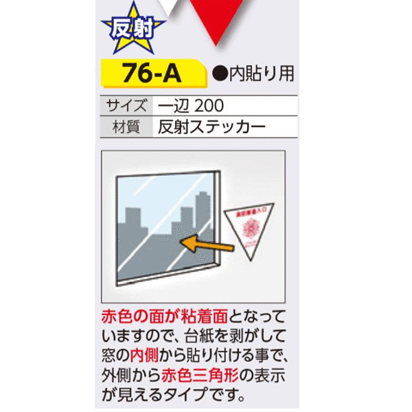 ■仕様  ●型式:76-A  ●サイズ:一辺200  ●材質:反射ステッカー  ●内貼り用