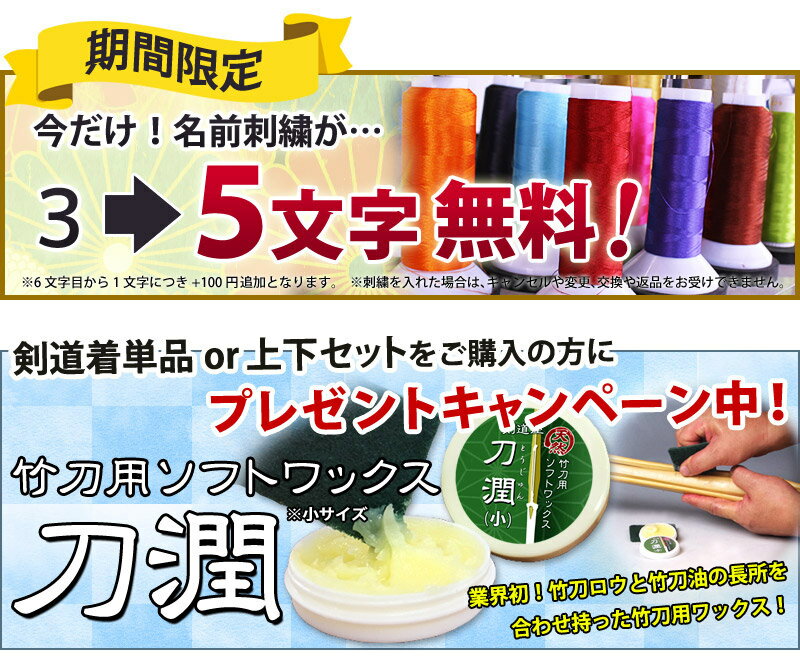 刺繍に関するよくあるご質問 Q.文字数の制限はありますか? Q.袴も3行の刺繍は可能ですか? Q.PCでは通常変換されない文字は可能ですか? Q.「辻」のしんにょうは、1つと2つの場合がありますが、どっちで製作になりますか? Q.アルファベットは刺繍できますか? Q.剣道着の左肩に刺繍ができますか? Q.袴の腰板に刺繍ができますか?袴の仕様について (洗濯について) 藍染と違い、化学染めのテトロン袴ですのでほとんど色落ちはいたしませんが、白物と一緒には洗濯しないで下さい。 洗濯機でも洗えますが、洗濯機との擦れによる腰板の傷みを防ぐために、腰板を内側に入れて袴を折りたたみ、 「洗濯ネット」に入れて「手洗いモード」で洗濯して下さい。 乾燥機で縮みはございません。 (生地について) アイロン温度は低 化繊のため摩擦に弱いので、転倒した場合など生地に摩擦熱で穴が開く場合があります。 (形について) 剣道では一般的な、股が分かれた馬乗り型です。 剣道着全般の仕様について ページ上に記載している基本事項以外の仕様については、品質向上やお客様のご要望の反映のために、 変更する場合があります。 以前にご購入いただいた商品と全く同じ仕様とはならない場合がございますので、 ご了解下さいますようお願いいたします。 剣道 袴 風Kaze 猛暑対策 良品館 京都武道具 武道園 西日本 カタギリ 一閃 東山堂 富士山 トップページ > 剣道 袴 >【刺繍5文字無料キャンペーン中】 剣道 剣道着 袴 《新特製》テトロン剣道袴・紺袴 ※パソコンのモニターの違いや、屋内屋外の光の当たり具合によって、写真の色合いが違って見えますので、ご了承下さい。 《新特製》テトロン剣道袴・紺 剣道屋人気ナンバー1の剣道袴。子供から大人までお使いになれます。 ■袴 《新特製》テトロン剣道袴・紺袴 (特徴)洗濯後もしわになりにくく、加えて乾きも早く縮み・色落ちはほぼありません。 綿袴と比べて大変軽く動きやすさ抜群です。 内ヒダ縫製加工済!内側のヒダに縫製が施されており、ヒダが取れず見栄えもよくなっています。 【ただいま、刺繍5文字無料キャンペーン中!】 【業界初!同時引き取りサービスで簡単サイズ交換 送料無料!】 【刺繍有りでも翌営業日発送!】 →刺繍に関するよくあるご質問について、ページ下部にまとめてありますのでご覧下さい。 ※刺繍文字数について※ お客様がご入力頂いた文字の合計(団体名と名前の合計)が、 5文字以上であった場合、6文字から1文字につき100円(税込110円)を加算させて頂きます。 カゴでは追加料金の自動計算がならないため、当店で金額を修正させて頂き メールにてお知らせいたしますのでご了承のほど宜しくお願いいたします。 ≪刺繍文字数は、団体名と名前の合計です≫ 団体名:剣道中学校 名前:剣道太郎 ⇒ 合計9文字(追加料金税込440円) 剣道 袴 風Kaze 猛暑対策 良品館 京都武道具 武道園 西日本 カタギリ 一閃 東山堂 富士山