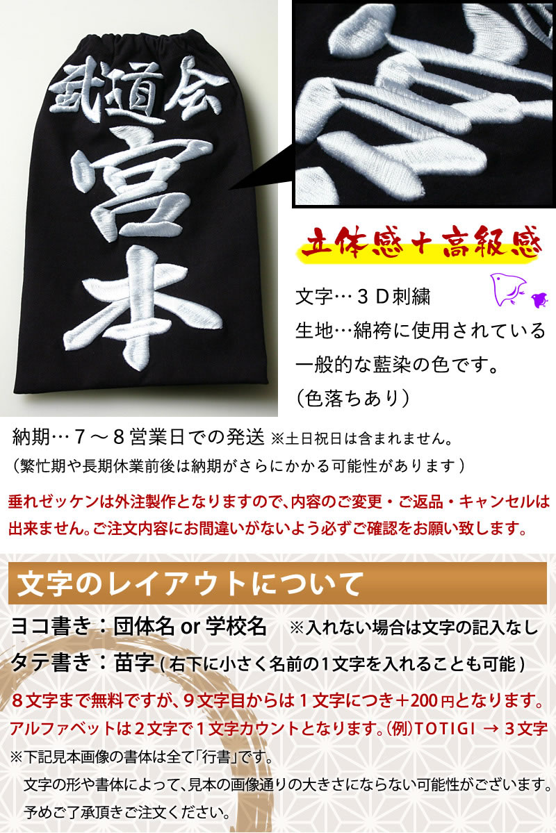 剣道屋トップ > ゼッケン・ネーム > 垂れネーム(垂れゼッケン) 3D ※大変申し訳ございませんが、現在ご注文受付から当店発送までに2週間程かかります。 ご了承の上ご注文頂きますようよろしくお願いいたします。(2024.11.25時点) 剣道 垂れネーム ゼッケン 名札 3D・垂れゼッケン ↑ ↑ ↑ ↑ ↑ 上記レイアウトの場合は、 必ず備考欄にご希望のレイアウトをご連絡下さい。 (例)1行目…栃木 2行目…剣友会 団体名の下に苗字 (例)苗字の上に横書き…栃木 苗字の下に横書き…JAPAN ※外注で製作となりますので、ご注文商品が全て揃ってからまとめて発送致します。 ※※大変申し訳ございませんが、現在ご注文受付から当店発送までに2週間程かかります。 ご了承の上ご注文頂きますようよろしくお願いいたします。(2024.11.25時点)年末年始など長期お休みの場合は納期が更にかかる場合がございます。 ※ご返品や注文してから届く間の変更・キャンセルは出来ません。 ※垂れと一緒にゼッケンをご注文を頂く場合のご注意※ サイズ交換が発生する可能性がございますので、 サイズ確定後、垂れゼッケンのご注文を頂く方が宜しいかと思います。