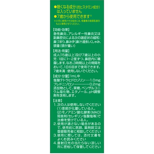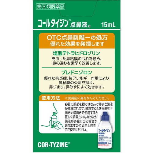 お店TOP>医薬品>鼻炎薬・耳の薬>鼻水・鼻づまり>鼻炎薬 鼻炎スプレー>コールタイジン点鼻液a (15ml(セルフメディケーション税制対象))お一人様3個まで。医薬品に関する注意文言この医薬品は指定第2類医薬品です。小児、高齢者他、禁忌事項に該当する場合は、重篤な副作用が発生する恐れがあります。詳しくは、薬剤師または登録販売者までご相談ください。【医薬品の使用期限】使用期限120日以上の商品を販売しております商品区分:指定第二類医薬品【コールタイジン点鼻液aの商品詳細】●コールタイジン点鼻液aは、アレルギー性鼻炎又は副鼻腔炎による鼻づまり、鼻みずなど不快な鼻炎症状を改善する鼻炎用点鼻薬です。【効能 効果】・急性鼻炎、アレルギー性鼻炎又は副鼻腔炎による次の諸症状の緩和:鼻づまり、鼻みず(鼻汁過多)、くしゃみ、頭重(頭が重い)【用法 用量】(年齢:1回量/1日使用回数)成人(15歳以上):1-2度ずつ鼻腔内に噴霧します。/3時間以上の間隔をおいて、6回まで使用できます。7歳以上15歳未満:1-2度ずつ鼻腔内に噴霧します。/3時間以上の間隔をおいて、6回まで使用できます。7歳未満:使用しないでください。★用法・用量に関連する注意・用法・用量を厳守してください。・過度に使用すると、かえって鼻づまりを起こすことがあります。・小児に使用させる場合には、保護者の指導監督のもとに使用させてください。・点鼻用にのみ使用してください。・目には使用しないでください。【成分】コールタイジン点鼻液aは、無色澄明の液剤で、1mL中の成分、分量は次のとおりです。塩酸テトラヒドロゾリン:1.0mgプレドニゾロン:0.2mg添加物:果糖、ベンザルコニウム塩化物、エタノール、pH調整剤【注意事項】★してはいけないこと(守らないと現在の症状が悪化したり、副作用が起こりやすくなります)・次の人は使用しないでください(1)患部が化膿している人。(2)モノアミン酸化酵素(MAO)阻害剤(セレギリン塩酸塩等)で治療を受けている人。・長期連用しないでください★相談すること・次の人は使用前に医師、薬剤師又は登録販売者に相談してください(1)医師の治療を受けている人。(2)妊婦又は妊娠していると思われる人。(3)薬などによりアレルギー症状を起こしたことがある人。(4)次の診断を受けた人。高血圧、心臓病、糖尿病、甲状腺機能障害、緑内障(5)高齢者。・使用後、次の症状があらわれた場合は副作用の可能性があるので、直ちに使用を中止し、製品の文書を持って医師、薬剤師又は登録販売者に相談してください(関係部位:症状)皮膚:発疹・発赤、かゆみ精神神経系:眠気、頭痛、めまい、ふるえ、不眠、脱力感鼻:はれ、刺激感、熱感、乾燥感、鼻みずその他:血圧上昇、動悸、不整脈、口の渇き、味覚異常・3日間位使用しても症状がよくならない場合は使用を中止し、製品の文書を持って医師、薬剤師又は登録販売者に相談してください★保管および取扱い上の注意・直射日光の当たらない涼しい所に密栓して保管してください。・小児の手の届かない所に保管してください。・他の容器に入れ替えないでください(誤用の原因になったり品質が変わります。)。・他の人と共用しないでください。・使用期限(外箱及び容器に記載)をすぎた製品は使用しないでください。【医薬品販売について】1.医薬品については、ギフトのご注文はお受けできません。2.医薬品の同一商品のご注文は、数量制限をさせていただいております。ご注文いただいた数量が、当社規定の制限を越えた場合には、薬剤師、登録販売者からご使用状況確認の連絡をさせていただきます。予めご了承ください。3.効能・効果、成分内容等をご確認いただくようお願いします。4.ご使用にあたっては、用法・用量を必ず、ご確認ください。5.医薬品のご使用については、商品の箱に記載または箱の中に添付されている「使用上の注意」を必ずお読みください。6.アレルギー体質の方、妊娠中の方等は、かかりつけの医師にご相談の上、ご購入ください。7.医薬品の使用等に関するお問い合わせは、当社薬剤師がお受けいたします。TEL:050-5577-5042email:kenkocom_4@shop.rakuten.co.jp【原産国】日本【発売元、製造元、輸入元又は販売元】アリナミン製薬株式会社リニューアルに伴い、パッケージ・内容等予告なく変更する場合がございます。予めご了承ください。広告文責:楽天グループ株式会社電話:050-5577-5042・・・・・・・・・・・・・・[鼻炎・アレルギー・耳の薬]
