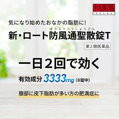 お店TOP>医薬品>生活習慣病>糖尿病・肥満>肥満の薬>和漢箋 新・ロート防風通聖散錠T (224錠(セルフメディケーション税制対象))お一人様3個まで。医薬品に関する注意文言【医薬品の使用期限】使用期限120日以上の商品を販売しております商品区分:第二類医薬品【和漢箋 新・ロート防風通聖散錠Tの商品詳細】●肥満を解消するためには、余分な脂肪を溜めずにしっかり落すことが大切です。防風通聖散は18種の生薬を組み合わせた漢方薬で、脂肪を分解・燃焼する働きがあり、おなか周りの脂肪など肥満症の改善に効果があります。便秘などにも効果的です。●「新・ロート防風通聖散錠T」はその力を十分に引き出すため、使用する生薬の量や、成分の抽出にもこだわりました。●1日2回の服用です。【効能 効果】・体力充実して、腹部に皮下脂肪が多く、便秘がちなものの次の諸症:高血圧や肥満に伴う動悸・肩こり・のぼせ・むくみ・便秘、蓄膿症(副鼻腔炎)、湿疹・皮膚炎、ふきでもの(にきび)、肥満症【用法 用量】次の量を1日2回、食前又は食間に、水又はお湯で服用すること。成人(15才以上)1回4錠、15才未満は服用しないこと★用法・用量に関連する注意用法・用量を厳守すること。※食間とは、食後2〜3時間をさす。【成分】(8錠中)防風通聖散エキス(2/3量):3333mg(キキョウ1.33g、ビャクジュツ1.33g、カンゾウ1.33g、オウゴン1.33g、セッコウ1.33g、ダイオウ1.0g、トウキ0.8g、シャクヤク0.8g、センキュウ0.8g、サンシシ0.8g、レンギョウ0.8g、ハッカ0.8g、ケイガイ0.8g、ボウフウ0.8g、マオウ0.8g、ショウキョウ0.27g、カッセキ2.0g、ボウショウ1.0gより抽出)添加物として、メタケイ酸アルミン酸Mg、バレイショデンプン、CMC-Ca、ステアリン酸Mgを含む※本剤は天然物(生薬)のエキスを用いているため、錠剤の色が多少異なることがある。【注意事項】★してはいけないこと(守らないと現在の症状が悪化したり、副作用が起こりやすくなります)1.本剤を服用している間は、次の医薬品を服用しないこと。 他の瀉下薬(下剤)2.授乳中の人は本剤を服用しないか、本剤を服用する場合は授乳を避けること。★相談すること1.次の人は服用前に医師、薬剤師又は登録販売者に相談すること。 (1)医師の治療を受けている人 (2)妊婦又は妊娠していると思われる人 (3)体の虚弱な人(体力の衰えている人、体の弱い人) (4)胃腸が弱く下痢しやすい人 (5)発汗傾向の著しい人 (6)高齢者 (7)今までに薬などにより発疹・発赤、かゆみ等を起こしたことがある人 (8)次の症状のある人:むくみ、排尿困難 (9)次の診断を受けた人:高血圧、心臓病、腎臓病、甲状腺機能障害2.服用後、次の症状があらわれた場合は副作用の可能性があるので、直ちに服用を中止し、この外箱を持って医師、薬剤師又は登録販売者に相談すること。関係部位:症状皮ふ:発疹・発赤、かゆみ消化器:吐き気・嘔吐、食欲不振、胃部不快感、腹部膨満、はげしい腹痛を伴う下痢、腹痛精神神経系:めまいその他:発汗、動悸、むくみ、頭痛まれに次の重篤な症状が起こることがある。その場合は直ちに医師の診療を受けること。症状の名称:症状間質性肺炎:階段を上ったり、少し無理をしたりすると息切れがする・息苦しくなる、空せき、発熱等がみられ、これらが急にあらわれたり、持続したりする。偽アルドステロン症:手足のだるさ、しびれ、つっぱり感やこわばりに加えて、脱力感、筋肉痛があらわれ、徐々に強くなる。ミオパチー:手足のだるさ、しびれ、つっぱり感やこわばりに加えて、脱力感、筋肉痛があらわれ、徐々に強くなる。肝機能障害:発熱、かゆみ、発疹、黄疸(皮ふや白目が黄色くなる)、褐色尿、全身のだるさ、食欲不振等があらわれる。腸間膜静脈硬化症:長期服用により、腹痛、下痢、便秘、腹部膨満等が繰り返しあらわれる。3.服用後、次の症状があらわれることがあるので、このような症状の持続又は増強がみられた場合には、服用を中止し、この外箱を持って医師、薬剤師又は登録販売者に相談すること。下痢、便秘4.1ヵ月位(便秘に服用する場合には1週間位)服用しても症状がよくならない場合は服用を中止し、この外箱を持って医師、薬剤師又は登録販売者に相談すること。5.長期連用する場合には、医師、薬剤師又は登録販売者に相談すること。★保管及び取扱い上の注意(1)直射日光の当たらない湿気の少ない涼しいところに密栓して保管すること。(2)小児の手の届かないところに保管すること。(3)他の容器に入れ替えないこと。(誤用の原因になったり品質が変わる)(4)湿気により、変色など品質に影響を与える場合があるので、ぬれた手で触れないこと。(5)使用期限を過ぎた製品は、服用しないこと。なお、使用期限内であっても一度開封した後はなるべく早く使用すること。【医薬品販売について】1.医薬品については、ギフトのご注文はお受けできません。2.医薬品の同一商品のご注文は、数量制限をさせていただいております。ご注文いただいた数量が、当社規定の制限を越えた