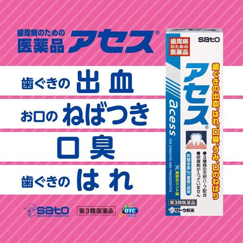 お店TOP>医薬品>口中薬>歯周病・虫歯・口臭>歯周病 はぐきみがき>アセス (160g*5コセット)お一人様2セットまで。医薬品に関する注意文言【医薬品の使用期限】使用期限120日以上の商品を販売しております商品区分:第三類医薬品【アセスの商品詳細】●歯ぐきからの出血、はれ、口臭などに効果をあらわす歯肉炎、歯槽膿漏薬です。●泡が立たず味も甘くないので、使い始めは違和感があるかもしれませんが、使いなれると口の中がさっぱりして、さわやかな使用感が得られます。●基剤には、歯に付着した汚れを落とす効果や、口内が酸性になっている場合、これを中和する作用があります。●研磨剤を含んでいないので不溶性のカスが残らず、歯ぐきを刺激することがありません。●赤かっ色のペースト状で、爽快なミント味です。【効能 効果】歯肉炎・歯槽膿漏の諸症状(出血・はれ・口臭・発赤・口のねばり・歯ぐきのむずがゆさ・歯ぐきからのうみ)の緩和【用法 用量】適量(1.0g、約3cm)を歯ブラシにつけて、1日2回(朝・夕)歯肉をマッサージするように磨きます。★用法・用量に関連する注意(1)定められた用法・用量を厳守してください。(2)小児に使用させる場合には、保護者の指導監督のもとに使用させてください。(3)一般の歯みがきと同じようにブラッシングした後、水ですすいでください。(4)歯科用にのみ使用してください。【成分】成分:分量カミツレチンキ:1.25%ラタニアチンキ:1.25%ミルラチンキ:0.62%添加物として、グリセリン、アルギン酸Na、薬用石ケン、ラウリル硫酸Na、サッカリンNa、赤色3号、ハッカ油、パラベン、炭酸水素Na、香料を含有します。★成分・分量に関連する注意本剤は、天然の生薬を用いた製剤ですので、製品により、色、味が多少異なる場合がありますが、効果には変わりありません。【注意事項】★相談すること1.次の人は使用前に医師、歯科医師、薬剤師又は登録販売者にご相談ください(1)医師又は歯科医師の治療を受けている人。(2)薬などによりアレルギー症状を起こしたことがある人。(3)次の症状のある人。ひどい口内のただれ2.使用後、次の症状があらわれた場合は副作用の可能性がありますので、直ちに使用を中止し、添付文書を持って医師、薬剤師又は登録販売者にご相談ください[関係部位:症状]皮膚:発疹・発赤、かゆみ3.しばらく使用しても症状がよくならない場合は使用を中止し、添付文書を持って医師、歯科医師、薬剤師又は登録販売者にご相談ください★保管及び取扱い上の注意(1)直射日光の当たらない湿気の少ない涼しい所に密栓して保管してください。(2)小児の手の届かない所に保管してください。(3)他の容器に入れ替えないでください。(誤用の原因になったり品質が変わるおそれがあります。)(4)乾燥するとかたまって出にくくなりますので、使用後は、キャップをしっかりしめてください。(5)寒さで硬くなり出し難い場合は、常温で保管すると出し易くなります。(6)チューブの末端部分が鋭くなっておりますので、ご使用の際に怪我をしないようご注意ください。(7)使用期限をすぎた製品は、使用しないでください。【医薬品販売について】1.医薬品については、ギフトのご注文はお受けできません。2.医薬品の同一商品のご注文は、数量制限をさせていただいております。ご注文いただいた数量が、当社規定の制限を越えた場合には、薬剤師、登録販売者からご使用状況確認の連絡をさせていただきます。予めご了承ください。3.効能・効果、成分内容等をご確認いただくようお願いします。4.ご使用にあたっては、用法・用量を必ず、ご確認ください。5.医薬品のご使用については、商品の箱に記載または箱の中に添付されている「使用上の注意」を必ずお読みください。6.アレルギー体質の方、妊娠中の方等は、かかりつけの医師にご相談の上、ご購入ください。7.医薬品の使用等に関するお問い合わせは、当社薬剤師がお受けいたします。TEL:050-5577-5042email:kenkocom_4@shop.rakuten.co.jp【原産国】日本【ブランド】アセス【発売元、製造元、輸入元又は販売元】佐藤製薬※説明文は単品の内容です。リニューアルに伴い、パッケージ・内容等予告なく変更する場合がございます。予めご了承ください。(acess)・単品JAN:4987316003597広告文責:楽天グループ株式会社電話:050-5577-5042・・・・・・・・・・・・・・[口の薬/ブランド:アセス/]
