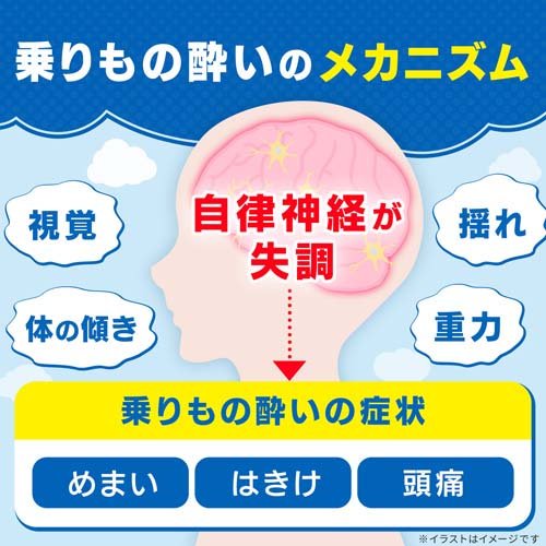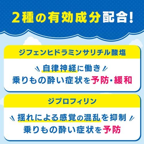 お店TOP>医薬品>乗り物酔い止め・眠気ざまし>乗り物酔い止め>乗り物酔い止め 大人用>トラベルミン (6錠*2箱セット)お一人様1セットまで。医薬品に関する注意文言【医薬品の使用期限】使用期限120日以上の商品を販売しております商品区分:第二類医薬品【トラベルミンの商品詳細】●トラベルミンは、乗りもの酔い症状の予防及び緩和に有効な、大人用の乗りもの酔い薬です。酔う心配がある場合、乗る30分前の服用により、乗りもの酔い症状が予防できます。また、酔ってしまった時でも、服用によって乗りもの酔い症状である「めまい」「吐き気」「頭痛」を改善し、旅行を楽しむことができます。【効能 効果】乗物酔いによるめまい・吐き気・頭痛の予防及び緩和【用法 用量】乗物酔いの予防には乗車船30分前に、次の1回量を水またはお湯で服用してください。[年齢:1回量:1日服用回数]成人(15才以上):1錠:4時間以上の間隔をおいて3回まで小児(15才未満):服用しないことなお、追加服用する場合には、1回量を4時間以上の間隔をおいて服用してください。1日の服用回数は3回までとしてください。・錠剤の取り出し方錠剤の入っているシートの凸部を指先で強く押して、裏面のアルミ箔を破り、錠剤を取り出して服用してください。(誤ってシートのままのみこんだりすると食道粘膜に突き刺さるなど思わぬ事故につながります。)【成分】1錠中に次の成分を含みます。[成分:含量]ジフェンヒドラミンサリチル酸塩:40mgジプロフィリン:26mg添加物:タルク、トウモロコシデンプン、乳糖、カルメロースCa、硬化油、酸化チタン、ステアリン酸Ca、セルロース、ヒプロメロース、マクロゴール、無水ケイ酸【注意事項】★してはいけないこと[守らないと現在の症状が悪化したり、副作用・事故が起こりやすくなる]1.次の人は服用しないでください。次の診断を受けた人緑内障、前立腺肥大2.本剤を服用している間は、次のいずれの医薬品も使用しないでください。他の乗物酔い薬、かぜ薬、解熱鎮痛薬、鎮静薬、鎮咳去痰薬、抗ヒスタミン剤を含有する内服薬等(鼻炎用内服薬、アレルギー用薬等)3.服用後、乗物又は機械類の運転操作をしないでください。(眠気等があらわれることがあります。)4.授乳中の人は本剤を服用しないか、本剤を服用する場合は授乳を避けてください。★相談すること1.次の人は服用前に医師、薬剤師又は登録販売者に相談してください。(1)医師の治療を受けている人(2)妊婦又は妊娠していると思われる人(3)薬などによりアレルギー症状を起こしたことがある人(4)次の症状のある人排尿困難(5)次の診断を受けた人てんかん、甲状腺機能障害2.服用後、次の症状があらわれた場合は副作用の可能性があるので、直ちに服用を中止し、添付文書を持って医師、薬剤師又は登録販売者に相談してください。[関係部位:症状]皮膚:発疹・発赤、かゆみ循環器:動悸泌尿器:排尿困難3.服用後、次の症状があらわれることがあるので、このような症状の持続又は増強が見られた場合には、服用を中止し、添付文書を持って医師、薬剤師又は登録販売者に相談してください。口のかわき、眠気★その他の注意本剤服用中、アルコール類を飲用しますと、薬の作用が強くあらわれることがありますので注意してください。★保管及び取扱い上の注意(1)直射日光の当たらない湿気の少ない涼しい所に保管してください。(2)小児の手の届かない所に保管してください。(3)他の容器に入れ替えないでください。(誤用の原因になったり品質が変わります。)(4)使用期限をすぎた製品は使用しないでください。【医薬品販売について】1.医薬品については、ギフトのご注文はお受けできません。2.医薬品の同一商品のご注文は、数量制限をさせていただいております。ご注文いただいた数量が、当社規定の制限を越えた場合には、薬剤師、登録販売者からご使用状況確認の連絡をさせていただきます。予めご了承ください。3.効能・効果、成分内容等をご確認いただくようお願いします。4.ご使用にあたっては、用法・用量を必ず、ご確認ください。5.医薬品のご使用については、商品の箱に記載または箱の中に添付されている「使用上の注意」を必ずお読みください。6.アレルギー体質の方、妊娠中の方等は、かかりつけの医師にご相談の上、ご購入ください。7.医薬品の使用等に関するお問い合わせは、当社薬剤師がお受けいたします。TEL:050-5577-5042email:kenkocom_4@shop.rakuten.co.jp【原産国】日本【ブランド】トラベルミン【発売元、製造元、輸入元又は販売元】エーザイ※説明文は単品の内容です。リニューアルに伴い、パッケージ・内容等予告なく変更する場合がございます。予めご了承ください。・単品JAN:4987028110552広告文責:楽天グループ株式会社電話:050-5577-5042・・・・・・・・・・・・・・[乗り物酔い止め/ブランド:トラベルミン/]