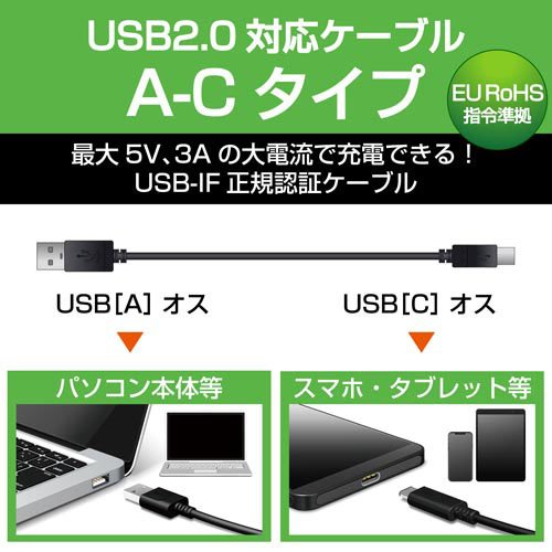 お店TOP>家電>情報家電>パソコンサプライ>データ通信ケーブル>エレコム USB-Cケーブル (A-タイプC) Type-C 0.5m ブラック MPA-AC05NBK (1個)【エレコム USB-Cケーブル (A-タイプC) Type-C 0.5m ブラック MPA-AC05NBKの商品詳細】●USB Standard-Aを搭載しているパソコン及び充電器、モバイルバッテリーなどに、USB Type-Cを搭載しているスマートフォンやタブレットを接続し、充電やデータ転送ができるUSB2.0ケーブルです。●USB2.0の規格である「Certified Hi-Speed USB(USB2.0)」の正規認証品です。●USB Type-Cコネクタは、ウラ、オモテに関係なく両面挿せます。●最大5V、3Aの大電流で接続機器の充電が可能です。※ご使用になるパソコンなどの性能によって、供給される電流値が異なります。USB PD(Power-Delivery)非対応です。●最大480Mbpsの高速データ転送が可能です。●難燃性の素材を使用し、安全性を高めています。●外部ノイズの干渉から信号を保護する2重シールドケーブルを採用しています。●サビなどに強く信号劣化を抑える金メッキピンを採用しています。●EUの「RoHS指令(電子・電子機器に対する特定有害物質の使用制限)」に準拠した環境にやさしい製品です。【規格概要】コネクタ形状:USB2.0 Standard-Aオス-USB Type-Cオス対応機種:USB Standard-A端子搭載のパソコン・充電器・モバイルバッテリーおよび、USB Type-C端子搭載のスマートフォン・タブレットなどケーブル長:0.5m ※コネクタ含むケーブル太さ:3.2mm規格:USB2.0規格正規認証品対応転送速度:最大480Mbps ※理論値プラグメッキ仕様:金メッキピンシールド方法:2重シールドツイストペアケーブル(通信線):○カラー:ブラックパッケージ形態:PET箱+紙台紙【ブランド】エレコム(ELECOM)【発売元、製造元、輸入元又は販売元】エレコムリニューアルに伴い、パッケージ・内容等予告なく変更する場合がございます。予めご了承ください。エレコム541-8765 大阪市中央区伏見町4丁目1番1号 9F0570-084-465広告文責:楽天グループ株式会社電話:050-5577-5042[携帯電話・スマートフォン周辺機器/ブランド:エレコム(ELECOM)/]